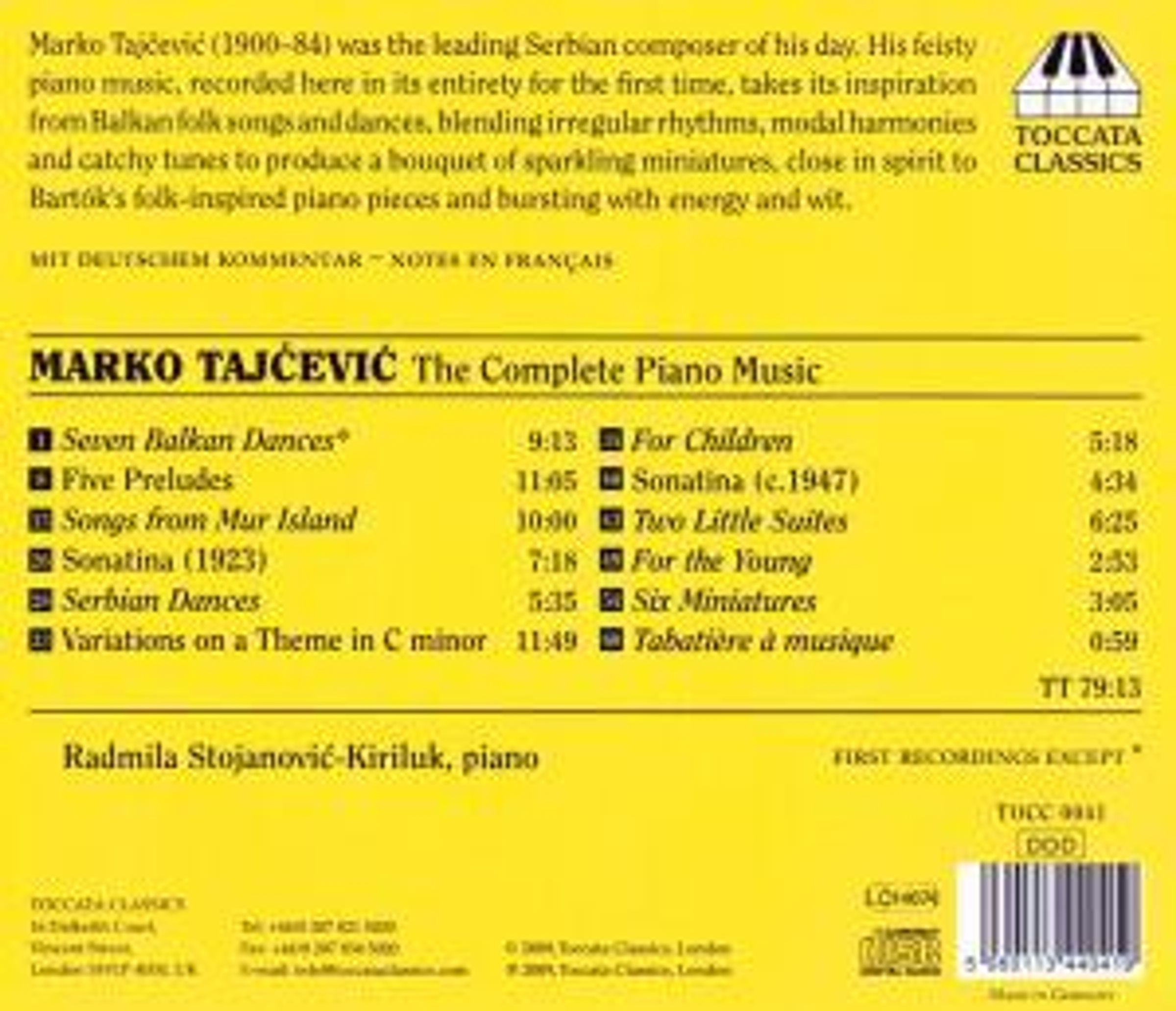 Tajčević (1900–84) war der führende serbische Komponist seiner Zeit. Seine lebhafte Klaviermusik, die hier zum ersten Mal vollständig aufgenommen wurde, ist von Volkstänzen des Balkans inspiriert und vermischt unregelmäßige Rhythmen, modale Harmonien und eingängige Melodien zu einem Strauß funkelnder Miniaturen, die im Geiste Bartóks volkstümlichen Klavierstücken nahe stehen und voller Energie und Witz.