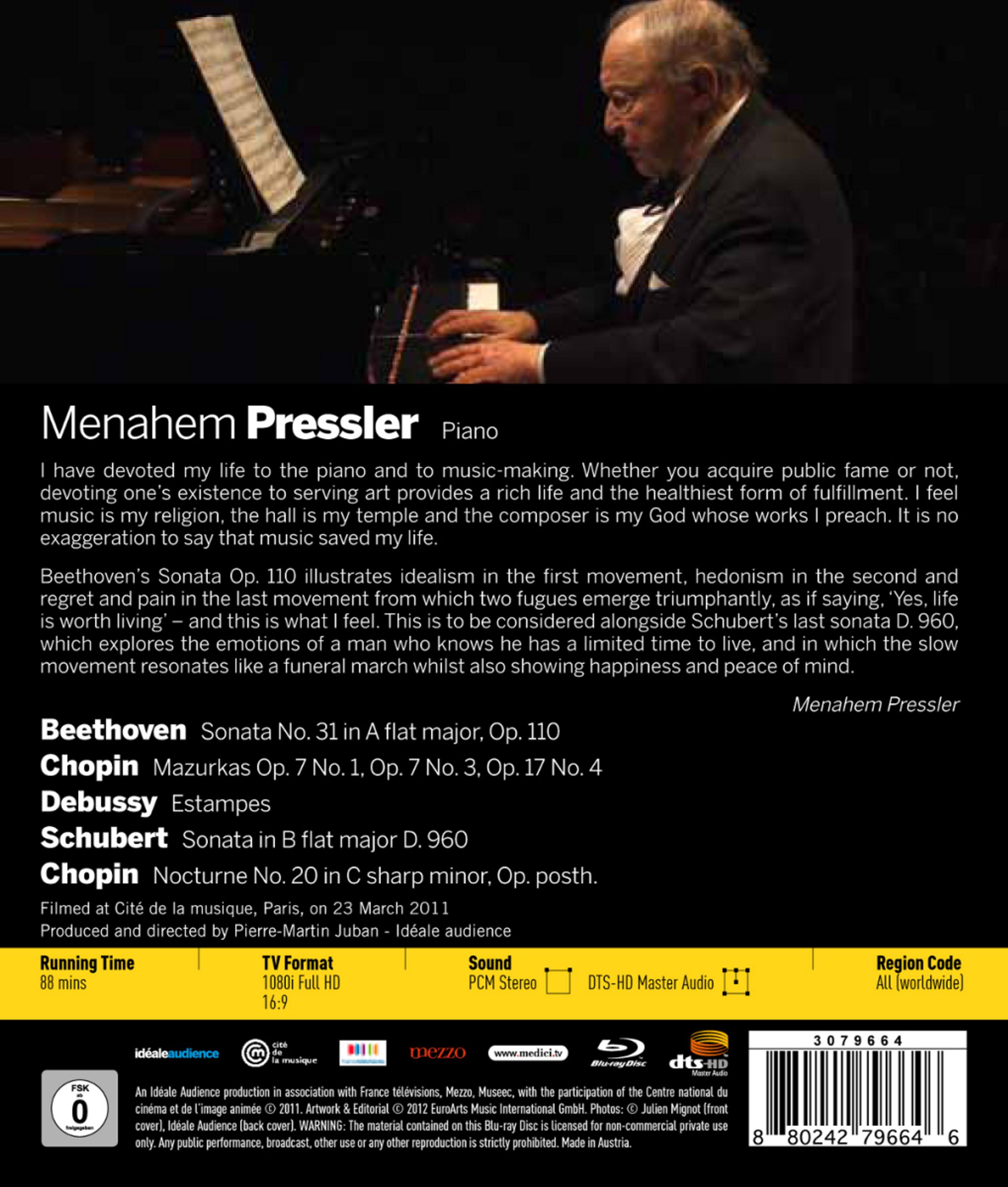 Menahem pressler ist der legendäre 1923 in Magdeburg geborene Pianist und Gründer des Beaux Arts Trio im SoloRecital. Er spielt die Beethoven Sonate Nr. 31 in As-Dur, Op. 110, die Chopin Mazurkas Op. 7 Nr. 1, Op. 7 Nr. 3 und Op. 17 Nr. 4, Debussy Estampes, Schubert Sonate in B-Dur D. 960 und die Chopin Nocturne Nr. 20 in c-Moll. Aufgenommen in der Cité de la musique, Paris, im März 2011.