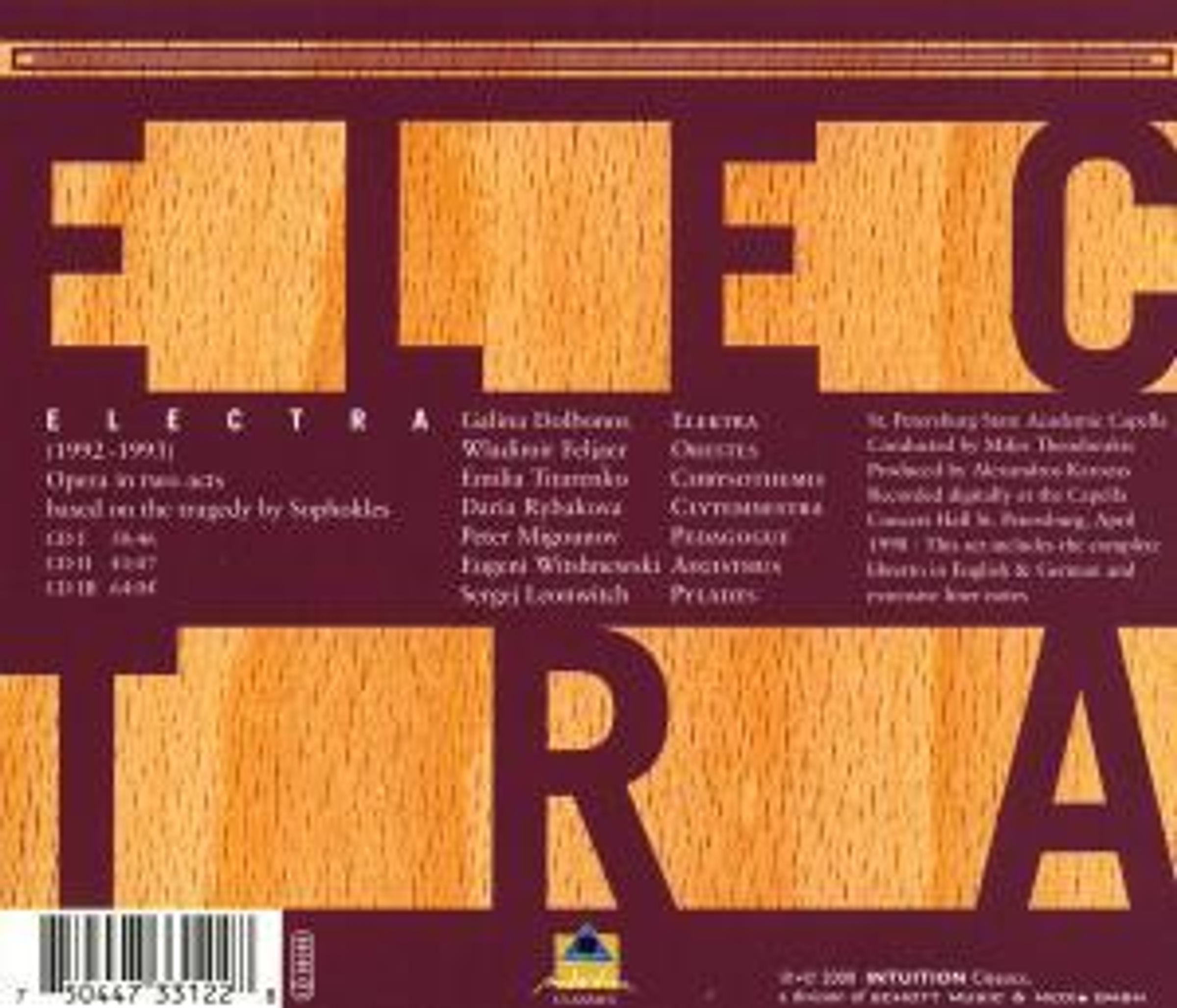 Als Basis für die Gestaltung der Handlung wählte der Komponist Sophokles' Fassung der berühmten Tragödie – demnach bildet die theodorakische Electra die Zentralfigur: Sie ist die Tochter des Königs Agamemnon, der nach zehn Jahren des Kampfes um Troja zu seinem Palast nach Mykene zurückkehrt, wo er – kaum eingetroffen – von seiner treulosen Frau Klytaimnestra und deren Liebhaber Aigisthos ermordet wird. Bald darauf heiratet das Mörderpaar; allerdings haben die beiden ihre Rechnung ohne Electra gemacht, die auf Rache für den gemeuchelten Vater sinnt... ''Electra'' wurde zwischen 1991 und 1994 komponiert; die Welturaufführung fand am 2. Mai 1995 im Stadttheater der ehemaligen europäischen Kulturhauptstadt Luxemburg statt. Die vorliegende Aufnahme wurde unter dem Dirigat von Mikis Theodorakis selbst mit dem St. Petersburger Staatsorchester und Chor eingespielt. (intuition-music. com)