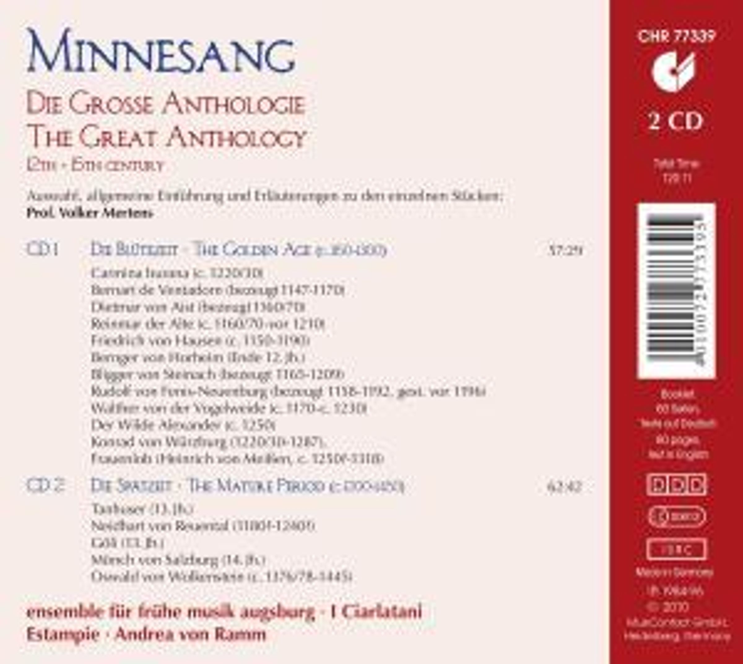 Die frühesten handschriftlichen Zeugnisse des deutschen Minnesangs stammen vom Ende des 12. Jahrhunderts. Ausgangs des 13. Jahrhunderts wird der Versuch zu großen „musealen“ Lyriksammlungen in Liederhandschriften erkennbar, die sich auf nicht erhaltene Handschriften stützten. Sammler waren in der Regel Privatleute mit literarischen Interessen. Gipfelpunkt der Aufzeichnungen ist die reine Textsammlung des sogenannten Codex Manesse. Aus diesem Grund haben nicht alle uns erhaltenen Quellen auch die Melodie aufgezeichnet. Die vorliegende Anthologie bietet einen repräsentativen und darüber hinaus preiswerten Überblick des deutschen Minnesangs vom 12. bis zum frühen 15. Jahrhundert, der durch eine informative Einführung des Mittelalter-Experten Volker Mertens ergänzt wird. Die Aufnahmen stammen allesamt aus dem umfangreichen Katalog von CHRISTOPHORUS.