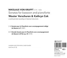 Nikolaus Freiherr von Krufft wurde als Sohn eines Staatsministers am 1. Februar 1779 in Wien geboren. Er studierte Komposition bei Albrechtsberger, Philosophie und Jura an der Universität Wien. Neben den hier eingespielten Fagott-Sonaten schrieb Krufft Sonaten für Geige und Horn sowie Werke für Klavier solo, darunter 24 Präludien & Fugen nach J. S. Bach. Seine Lieder nehmen einen besonderen Platz in Kruffts Werk ein und hatten großen Einfluss auf Franz Schubert.