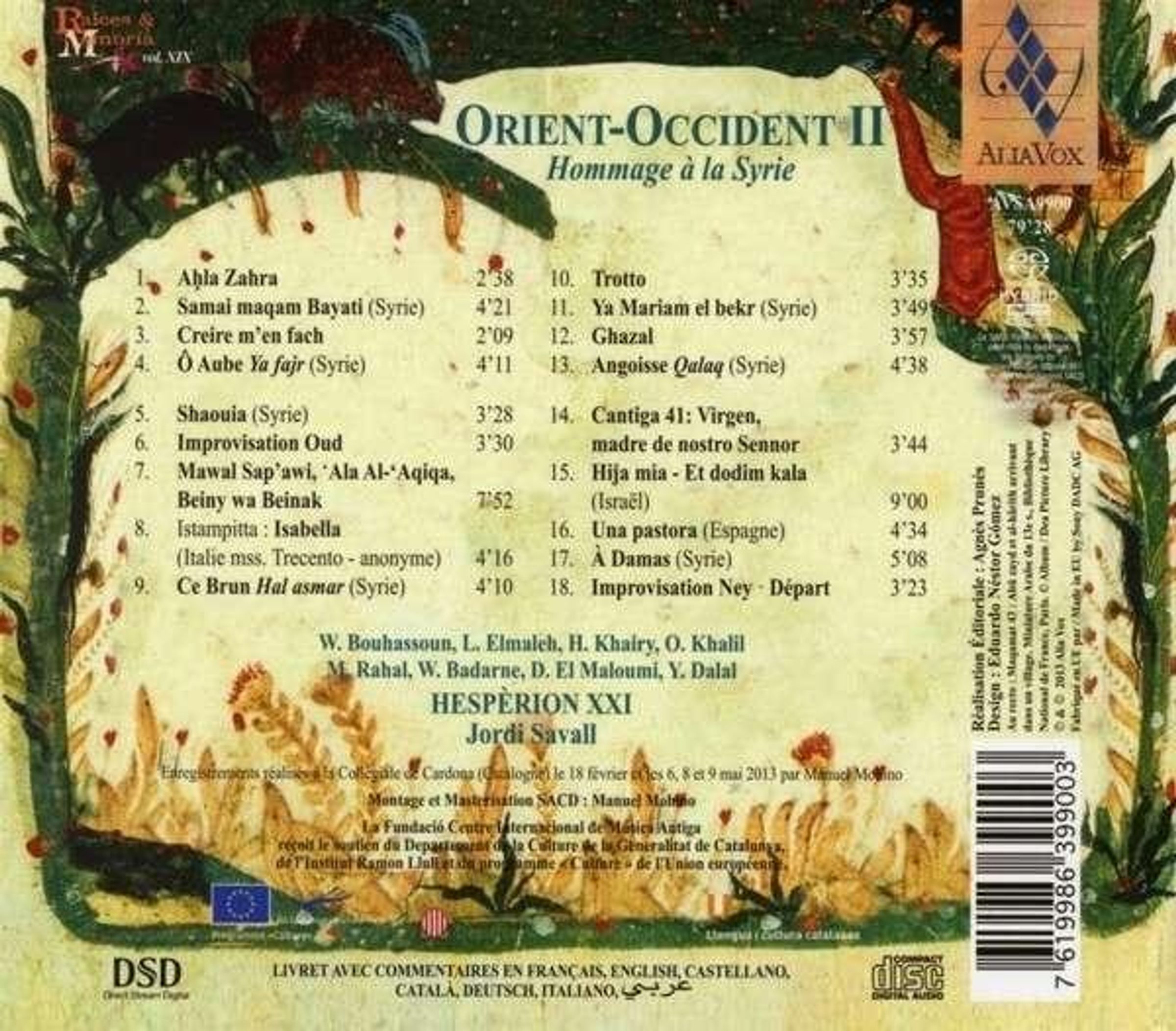 Der erste Band »Orient-Occident« aus dem Jahr 2006 entpuppte sich als Meilenstein in der Diskografie von Jordi Savall. Erstmals hatte der Maestro mit der gleichen musikwissenschaftlichen Kompetenz, wie schon zum Beispiel bei der Wiederentdeckung der Werke von Marin Marais, außereuropäisches Repertoire erforscht. Das Album wurde bald ein Bestseller.