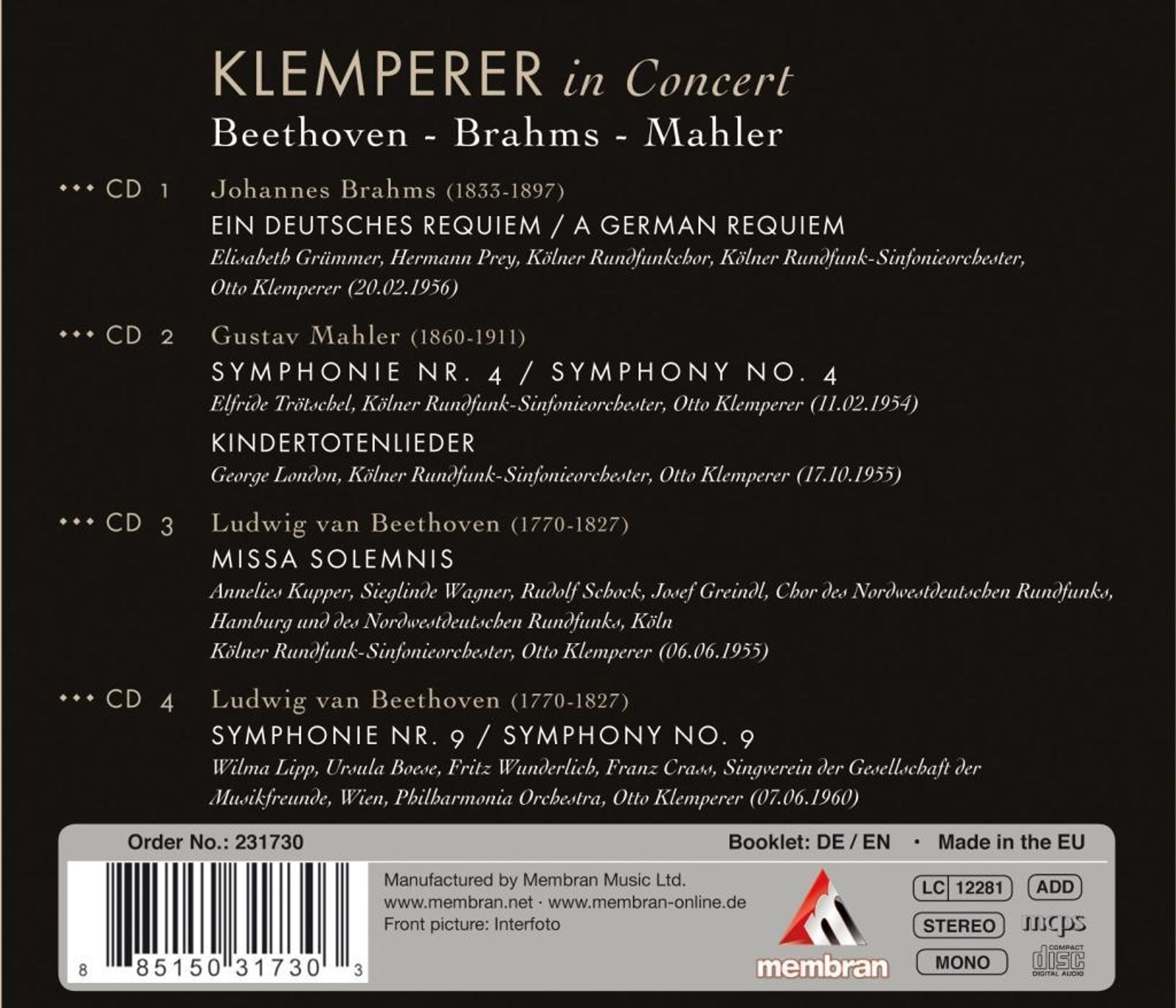 Elisabeth Grümmer, Hermann Prey, Elfride Trötschel, George London, Annelies Kupper, Rudolf Schock, Wilma Lipp, Fritz Wunderlich, Franz Crass, Kölner Rundfunkchor, Kölner Rundfunk-Sinfonie-Orchester, Philharmonia Orchestra, Otto Klemperer