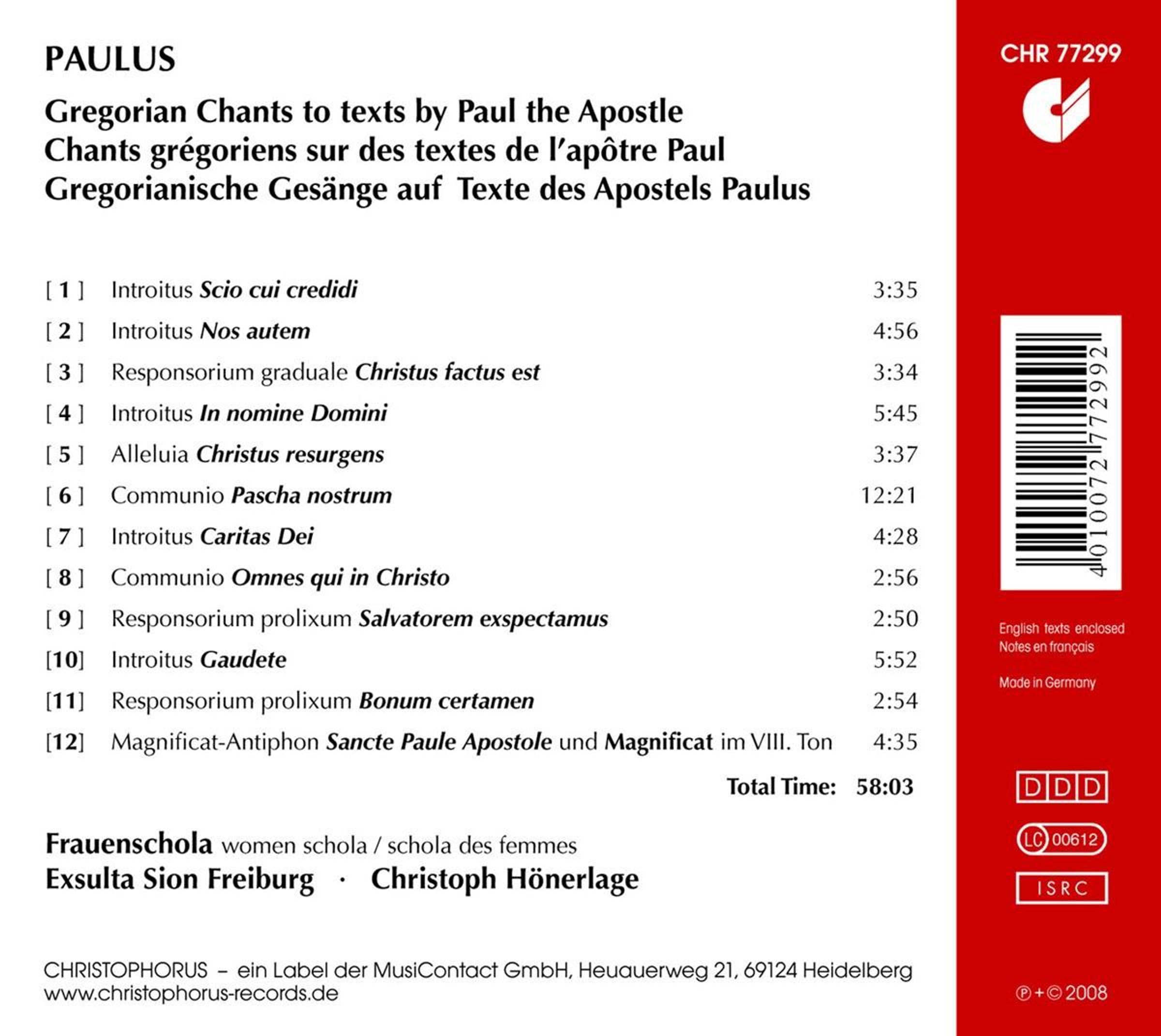 Paulus gilt seit seinem sprichwörtlich gewordenen Damaskuserlebnis im Jahre 32 / 33 als erster und wichtigster Theologe des Christentums. Die Frauenschola Exsulta Sion Freiburg stellt zum Paulusjahr Gregorianische Gesänge über Texte des Apostels vor. Viele Textpassagen aus den Briefen des Hl. Paulus haben schon früh Eingang in die Liturgie der katholischen Kirche gefunden und wurden im Mittelalter mit Gregorianischen Melodien versehen. Der Leiter der Schola, Christoph Hönerlage, führt in einem umfangreichen Begleittext in Leben und Theologie des Apostels ein.