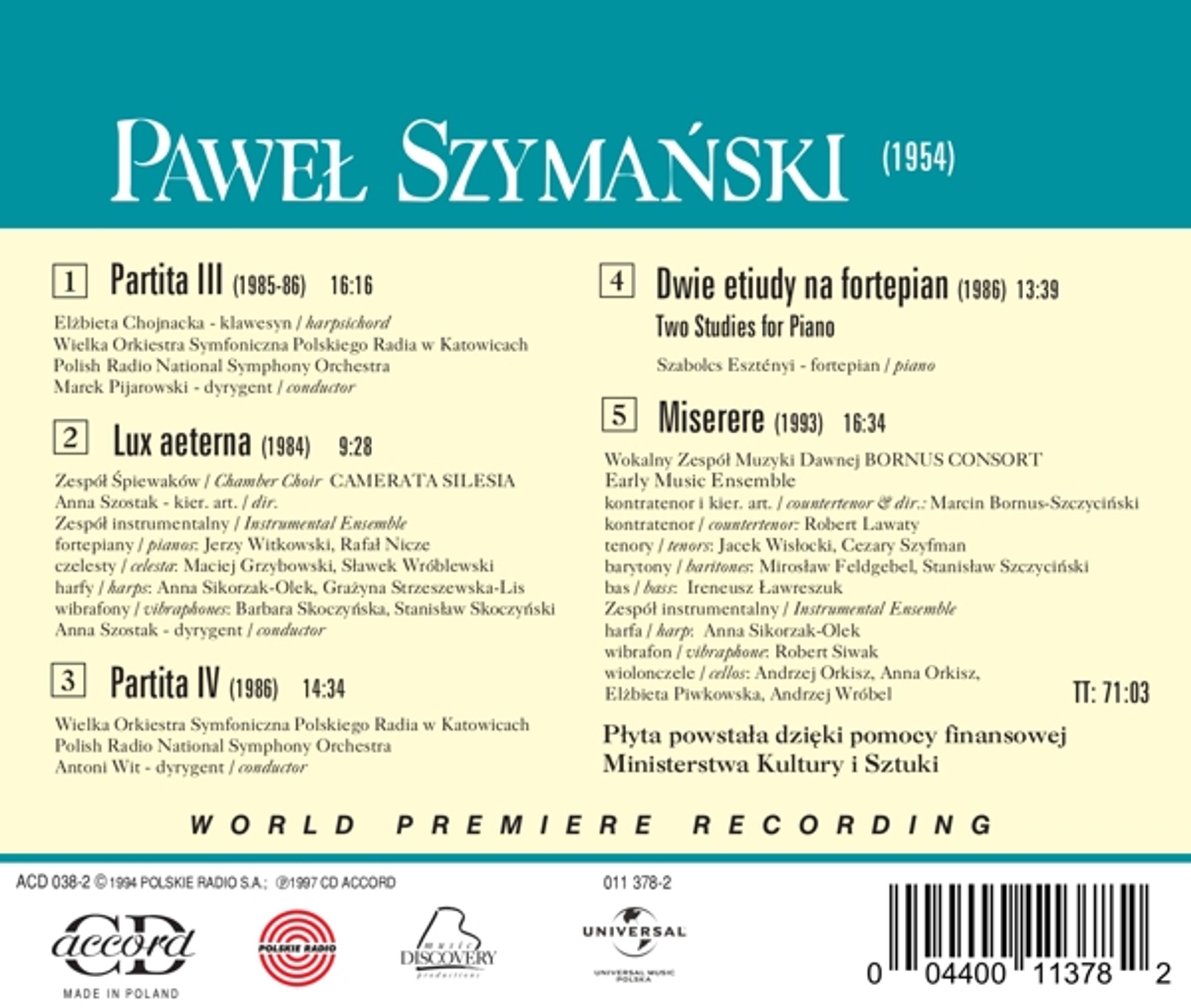 - Elisabeth Chojnacka, Szabolc Esztenyi, Bornus Consort, Camerata Silesia, Polish Radio Nationa SO, Marek Pijarowski, Antoni Wit