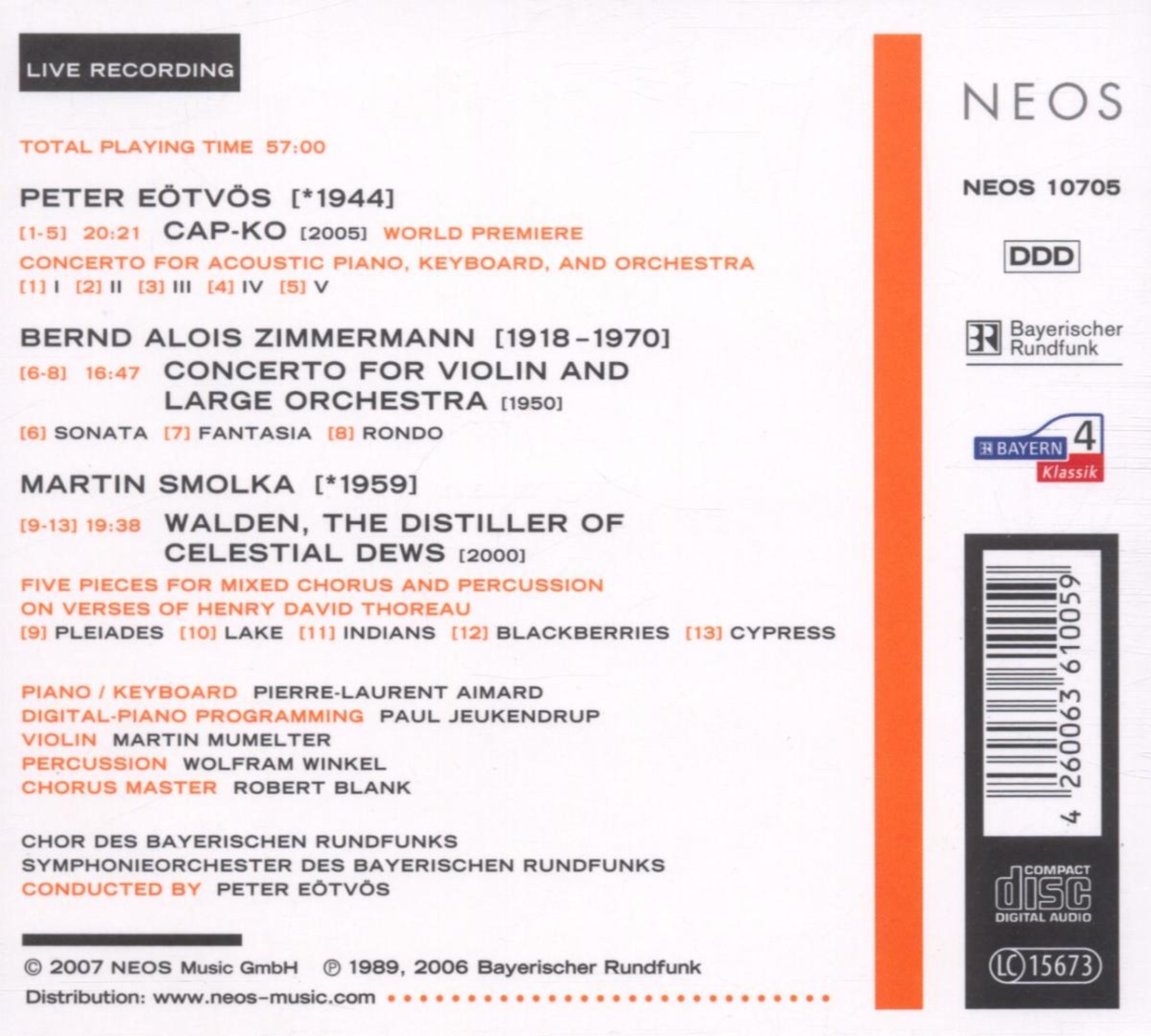 FonoForum 11/07: »Sein Klavierkonzert ›Cap-Ko‹ ist Bartók zugeeignet. Dessen Vorliebe für parallel geführte Linien realisiert Eötvös durch ein programmiertes Keyboard. So kann Pierre-Laurent Aimard mit einem Anschlag zwei Töne produzieren. Bernd Alois Zimmermann setzte in seinem Violinkonzert auf expressive Montagen. Martin Smolka vertont dagegen Texte von Thoreau in tonaler Einfachheit, schmuggelt aber Trübungen ein. Eine schöne Intervention.«Disk 1 von 1 (CD)