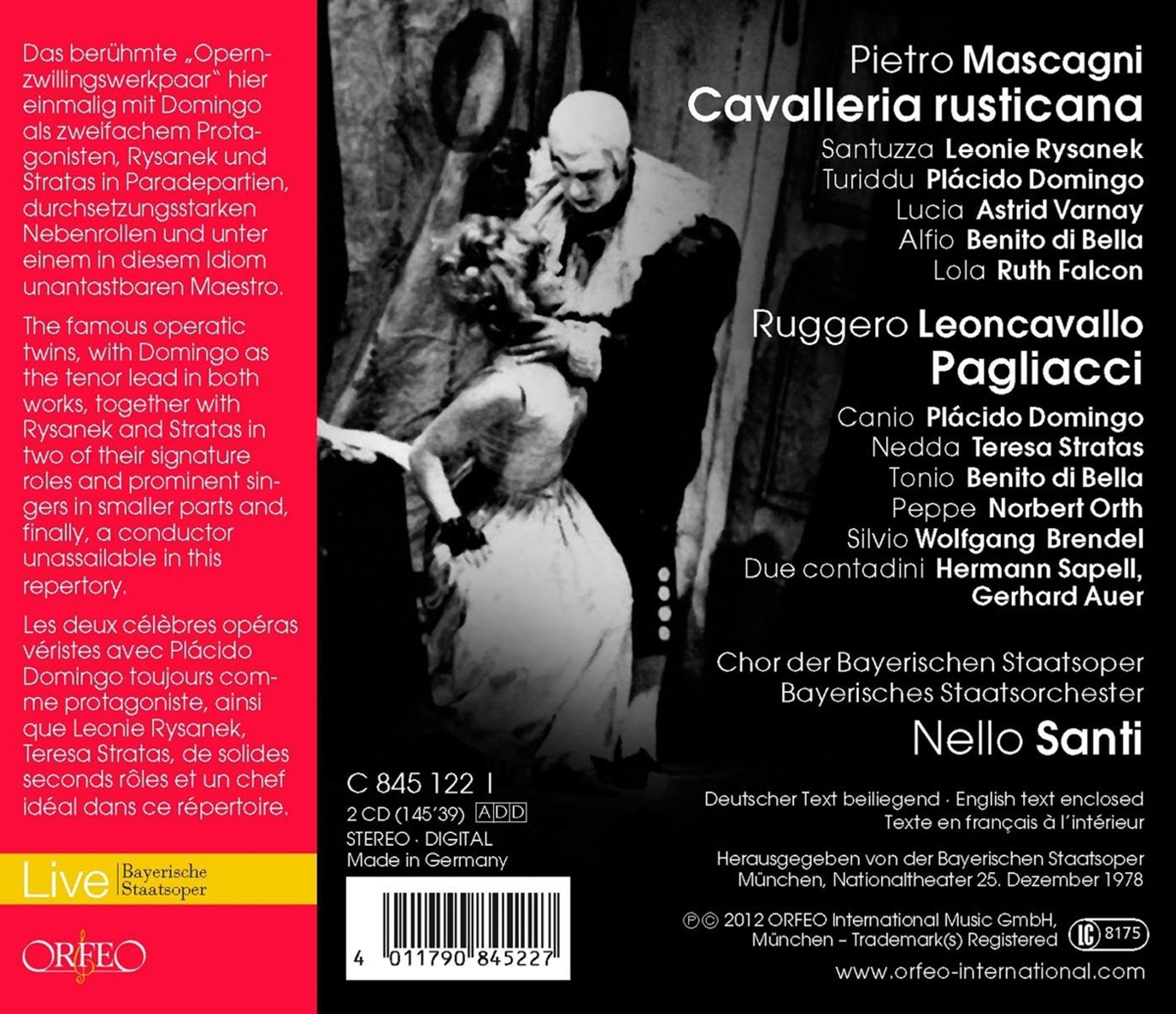 ,,Placido Domingo in beiden Tenorrollen, Leonie Rysanek als Santuzza, Astrid Varnay als Mamma Lucia, Teresa Stratas als Nedda und Wolfgang Brendel als Silvio - das ist pralles, aufregendes Musiktheater fern jeder musikalischen Erbsenzählerei." (Audio, Oktober 2012)Tracklisting