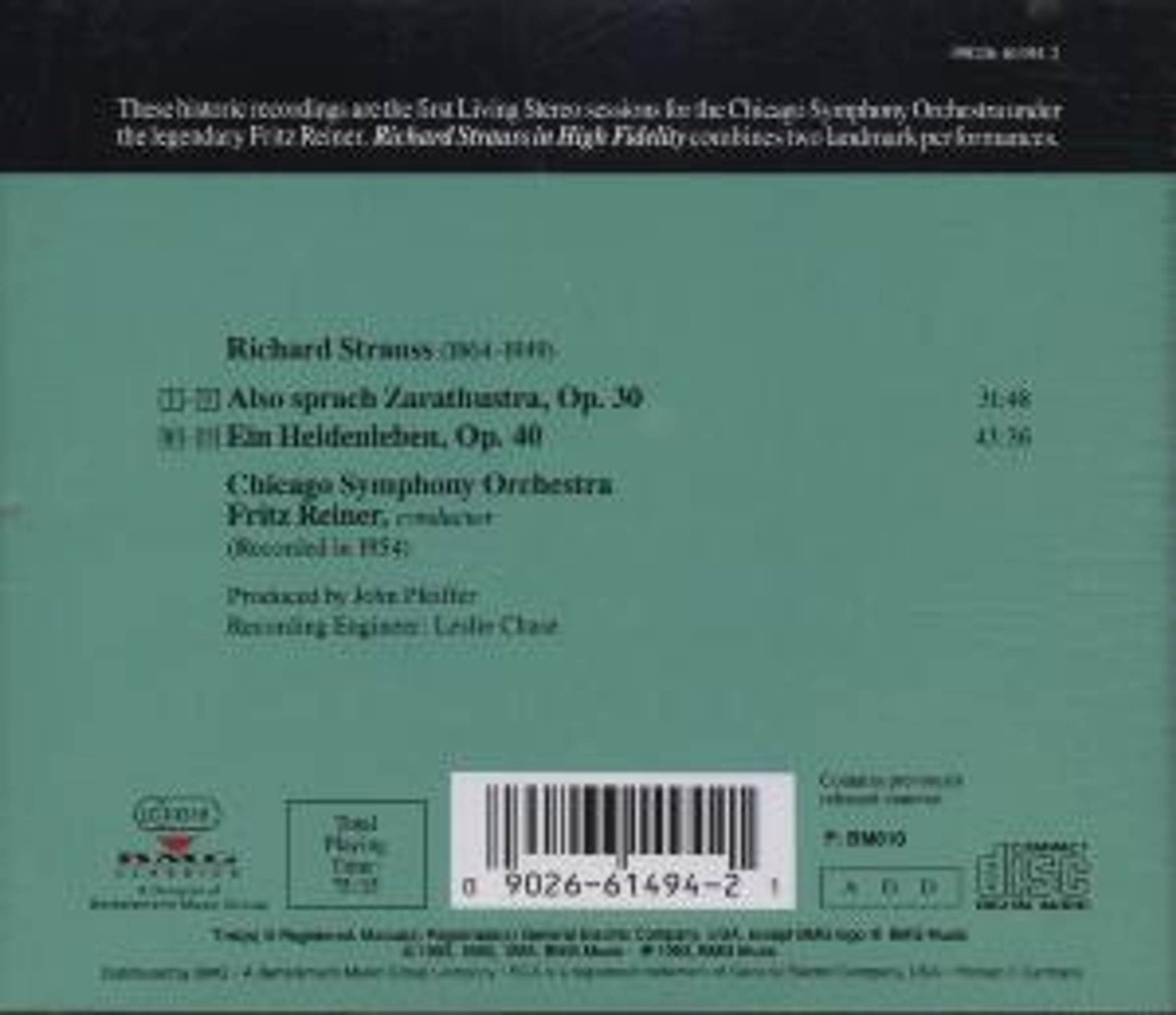 P. Cosse in FonoForum 6/93: "Reiners große Strauss-Darbietungen, in deren Verlauf über die rein klangliche Dimension hinaus auch deutlich wird, daß Orchester-Präzision und interpretatorische Strenge die besten Mittel (geblieben) sind, um die üppigen, ausufern- den 'Zarathustra'- und 'Heldenleben'-Geschich- ten als große, aber lebenswichtige Begeben- heiten durchsetzen zu können."Disk 1 von 1 (CD)