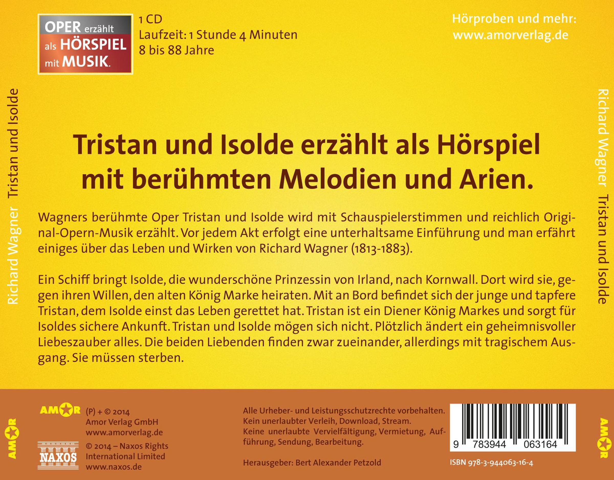 Tristan und Isolde - erzählt als Hörspiel mit berühmten Melodien und Arien. Wagners berühmte Oper Tristan und Isolde wird mit großartigen Schauspielerstimmen, effektvollen Geräuschen und reichlich Original-Opern-Musik erzählt. Vor jedem Akt erfolgt eine interessante Einführung und man erfährt einiges über Leben und Werk von Richard Wagner (1813 - 1883). Ein Schiff bringt Isolde, die wunderschöne Prinzessin von Irland, nach Cornwall. Dort wird sie, gegen ihren Willen, den alten König Marke heiraten. Mit an Bord befi ndet sich der junge und tapfere Tristan, dem Isolde einst das Leben gerettet hat. Tristan ist ein Diener König Markes und sorgt für Isoldes sichere Ankunft. Tristan und Isolde mögen sich nicht. Plötzlich ändert ein geheimnisvoller Liebeszauber alles. Die beiden Liebenden fi nden zwar zueinander, allerdings mit tragischem Ausgang. Sie müssen sterben.