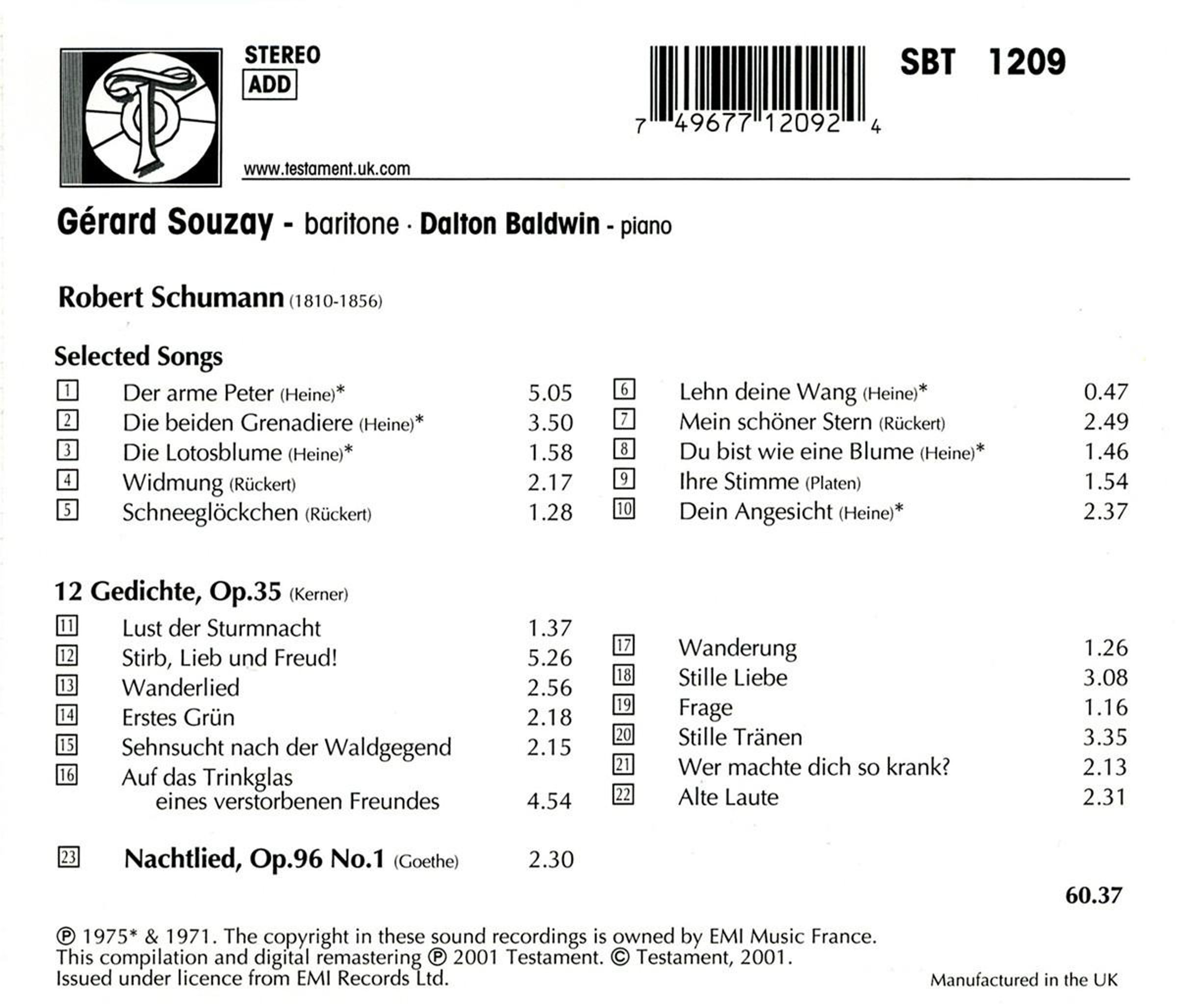 Der Bariton Gérard Souzay war gewiß einer der größten französischen Sänger des 20. Jahrhunderts. Seine beispiellose Kunst mit fremden Sprachen umzugehen und seine immense Musikalität erlaubten ihm eine auf jedes einzelne Lied zugeschnittene Interpretation.