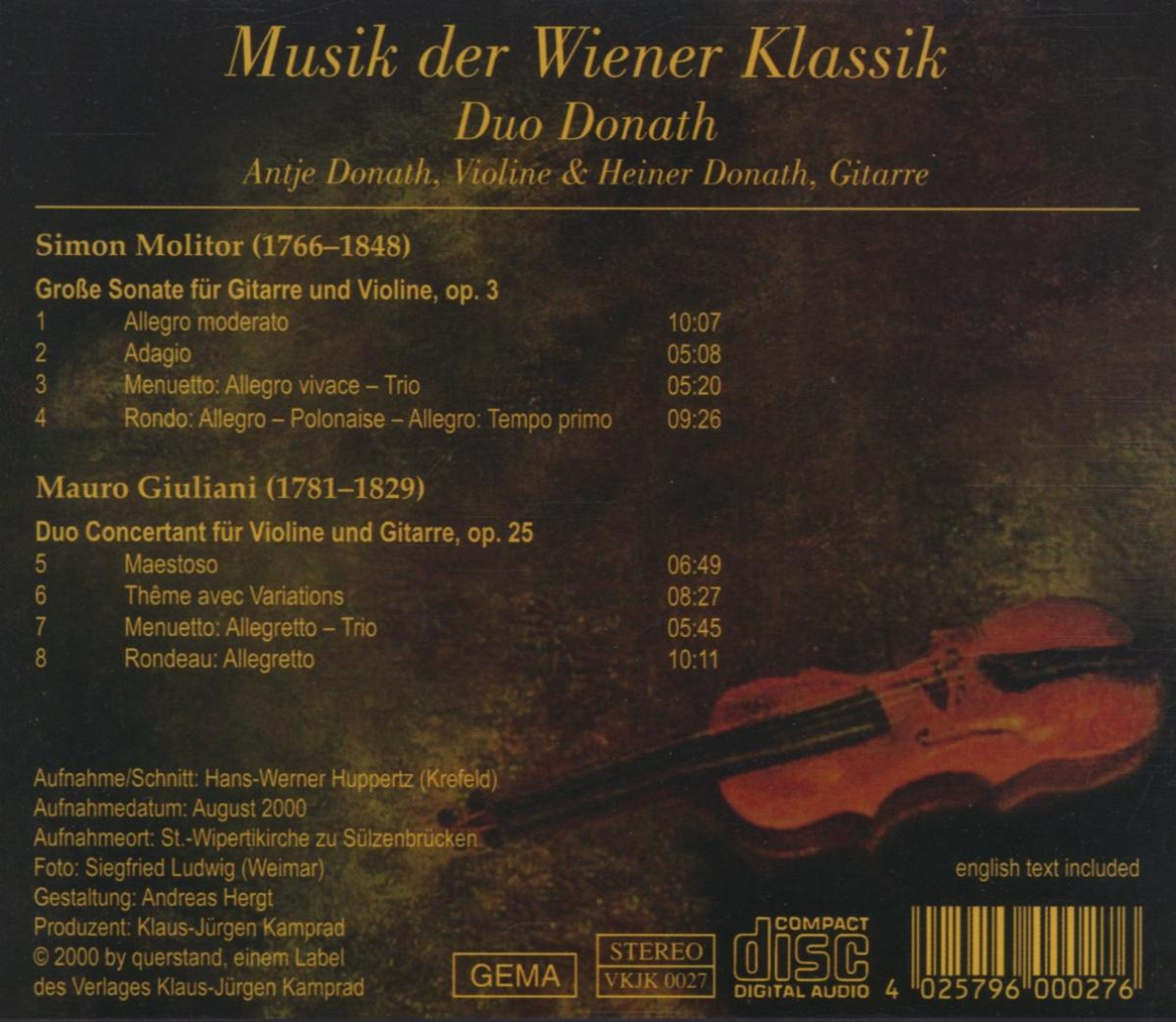 Molitors »Große Sonate« liegt auf dieser CD in einer Weltersteinspielung in voller Länge vor und stellt ebenso ein hochgradig entdeckenswertes Stück Musik dar. Antje und Heiner Donath, seit einer Dekade als Duo agierend, verstehen es ausgezeichnet, die von Molitor und Giuliani vorgegebenen Beziehungen auszuloten, ihnen Leben einzuhauchen und ihre Tiefe zu erfassen, was diese CD zu einem ungewöhnlichen, aber faszinierenden Hörerlebnis macht.