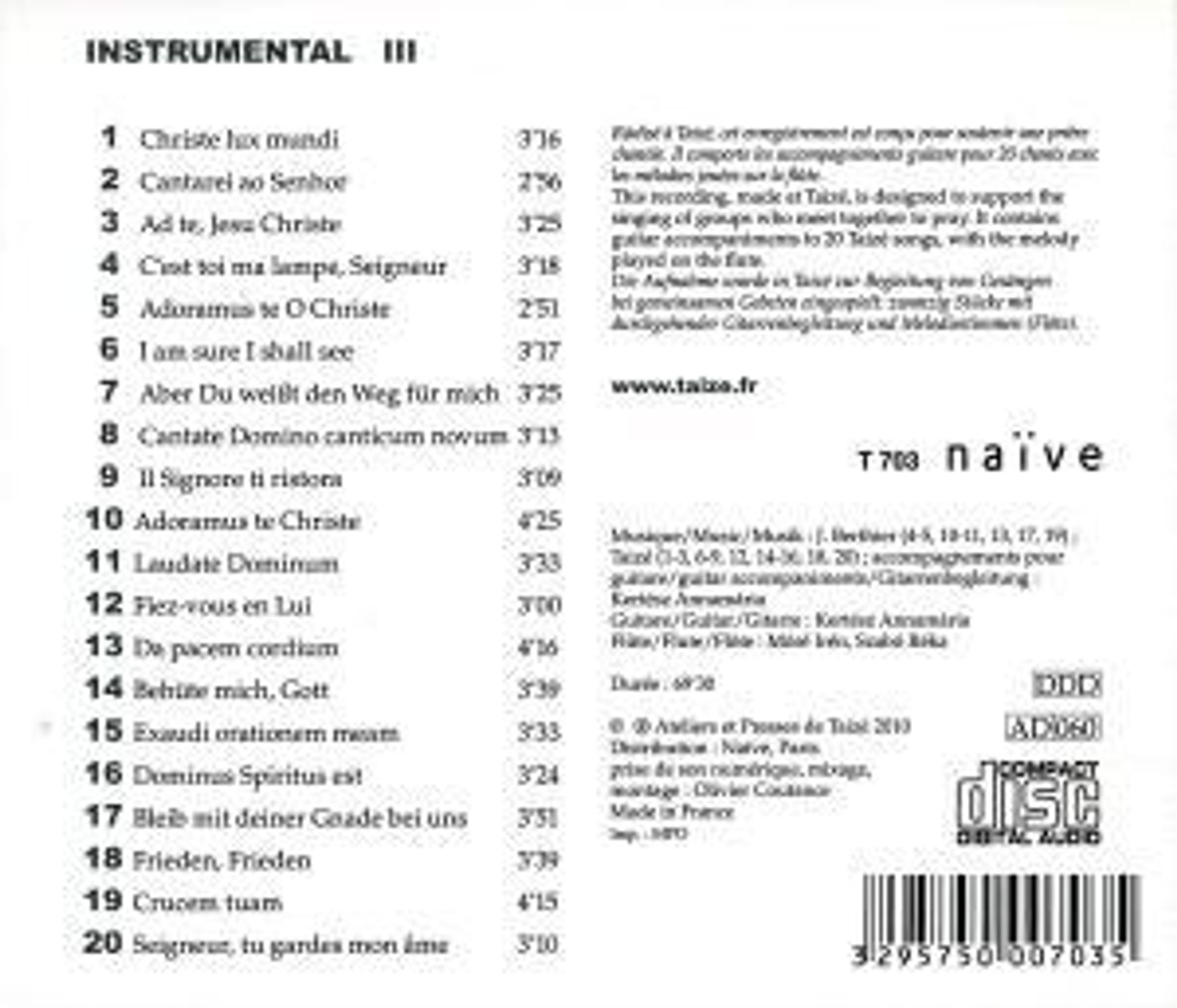 Die Bedeutung der Gesänge von Taizé hat der Gründer Frère Roger einmal so zusammengefasst: „Schlichtheit im Herzen führt ins kontemplative Gebet. In ihm kann man sich ganz Gott überlassen, sich zu ihm hintragen lassen. Für alle, die sich Gott anheim geben wollen, können einfache, oft wiederholte Gesänge eine Hilfe sein. Diese Gesänge klingen im Herzen nach, bei der Arbeit wie in der Freizeit.“ Wie schon die beiden ersten rein instrumentalen Alben, so soll auch mit der dritten Folge von Taizé instrumental den Menschen die Möglichkeit gegeben werden, eine Begleitung zum gemeinsamen Gebet zu haben – egal ob eine A-cappella-Ausführung gerade nicht möglich sein sollte oder keine Instrumentalisten zur Verfügung stehen. Über den praktischen Nutzen hinaus kann man aber auch diesmal einfach nur die eingängigen Melodien der Gesänge aus Taizé genießen, die Körper und Seele entspannenlassen