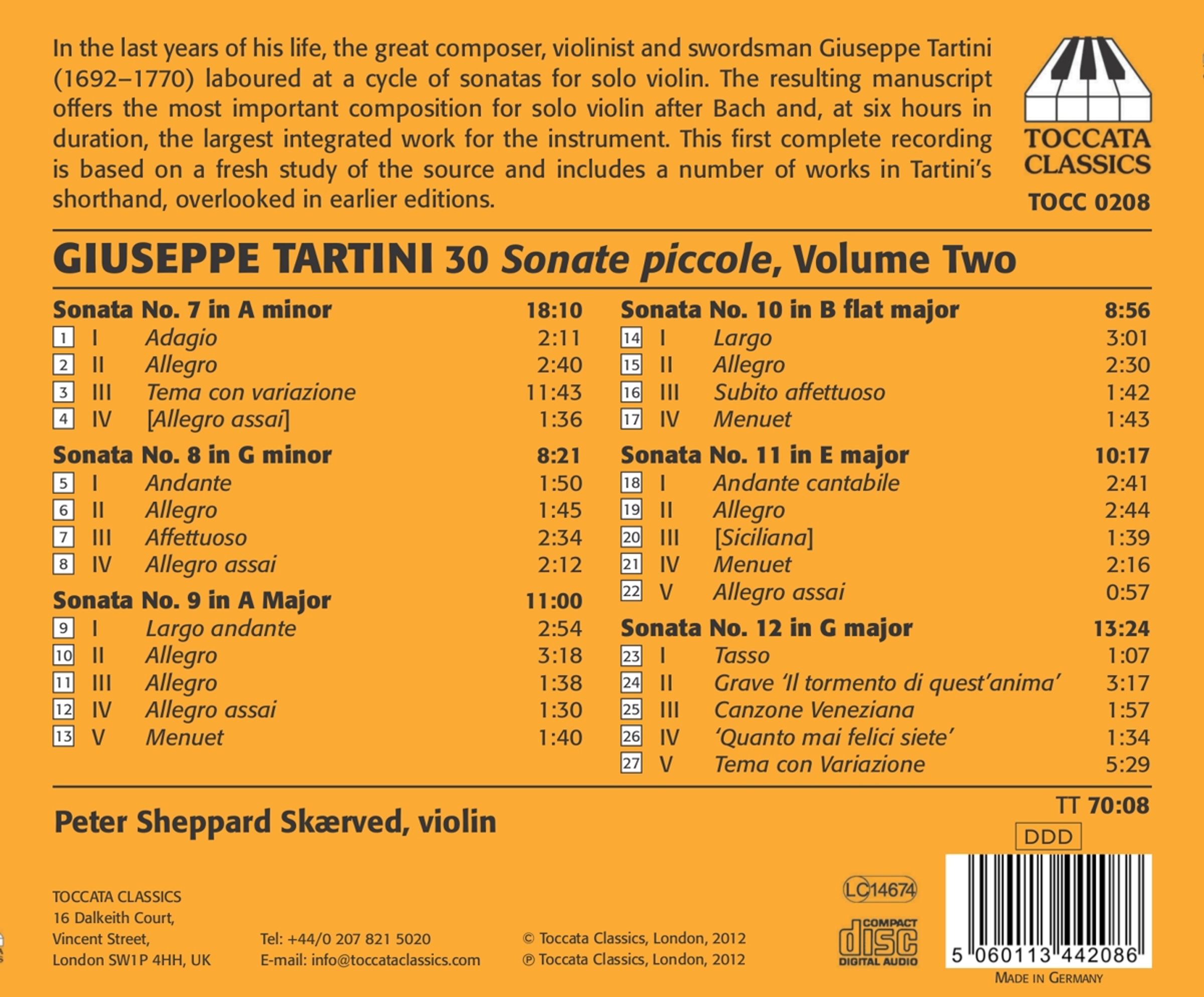 In the last years of his life, the great composer, violinist and swordsman Giuseppe Tartini (1692–1770) laboured at a cycle of sonatas for solo violin. The resulting manuscript offers the most important composition for solo violin after Bach and, at six hours in duration, the largest integrated work for the instrument. This first complete recording is based on a fresh study of the source and includes a number of works in Tartini’s shorthand, overlooked in earlier editions.