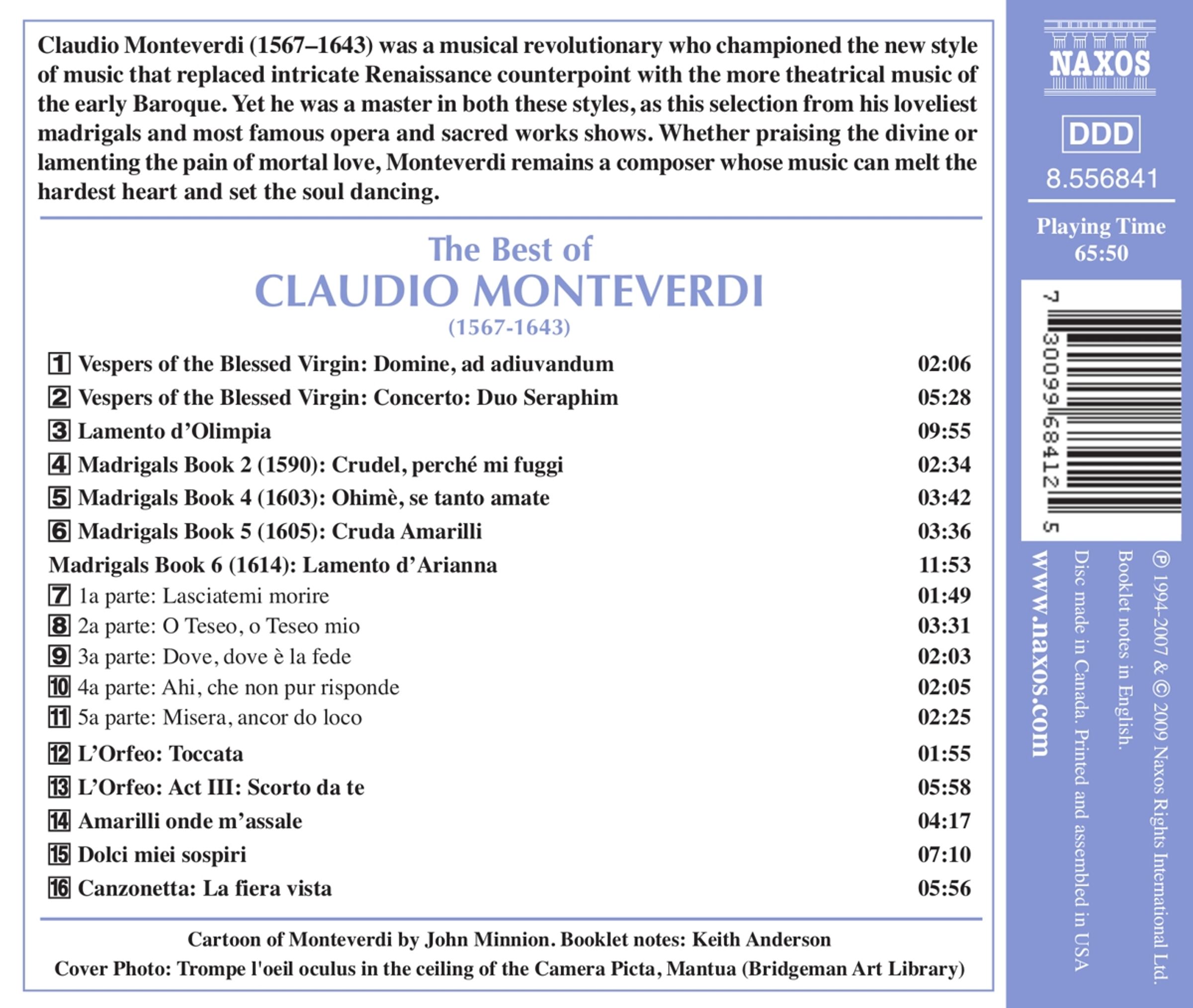 Claudio Monteverdi (1567-1643) was a musical revolutionary who championed the new style of music that replaced intricate Renaissance counterpoint with the more theatrical music of the early Baroque. Yet he was a master in both these styles, as this selection from his loveliest madrigals and most famous opera and sacred works shows. Whether praising the divine or lamenting the pain of mortal love, Monteverdi remains a composer whose music can melt the hardest heart and set the soul dancing.