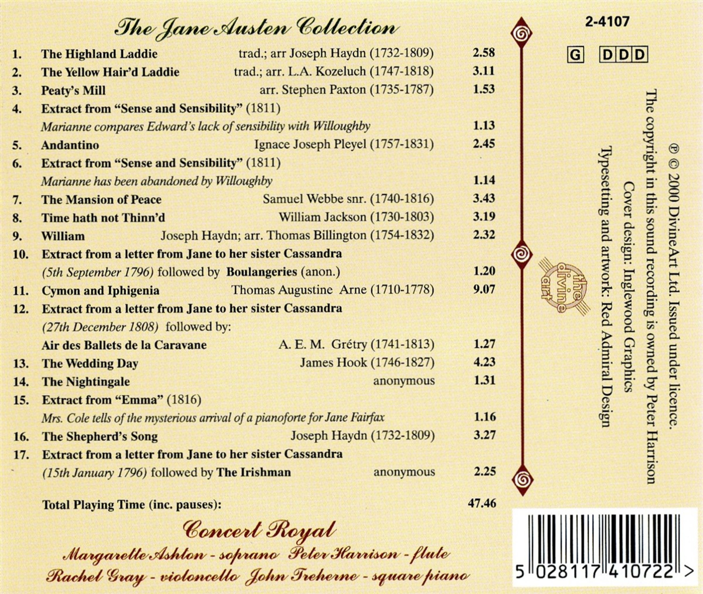 The Higland Laddie (Traditional);The Yellow Hair'd Laddie (Traditional);Peaty's Mill (Stephen Paxton); Sense & Sensibility (Ausz.);Andantino (Ignaz Pleyel); The Masion of Peace (Samuel Webbe sr.);Time hath not Thinn'd (William Jackson);William (Haydns / Billington); A Letter from Jane to her sister Cassandra (Ausz./Anonymus); Cymon & Iphigenia (Thomas Augustine Arne);Air des Ballets de la Caravane (A. E.M. Gretry);The Wedding Day (James Hook); The Nightingale (Anonymus);Emma (Ausz.);The Shepherd's Song (Joseph Haydn)