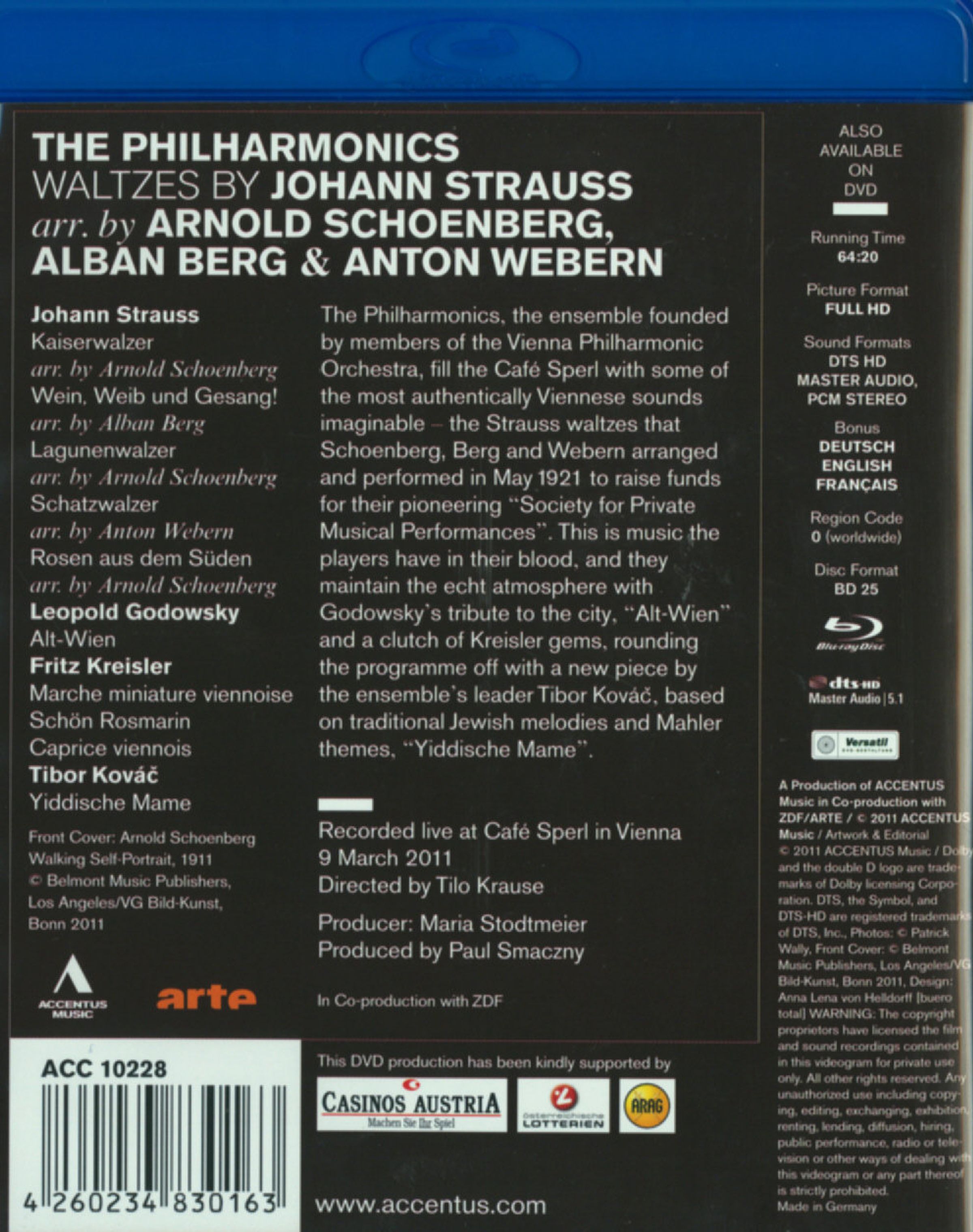 Accentus Music präsentiert mit dieser neuesten Veröffentlichung eine Aufnahme der Philharmonics, dem Ensemble, das von Mitgliedern der Wiener Philharmoniker gegründet wurde. An einem der originalen Schauplätze der Wiener Kaffeehauskultur, dem Café Sperl, wurden die authentischsten Alt-Wiener-Klänge eingefangen: die Wiener Walzer von Johann Strauß, arrangiert von Arnold Schönberg, Alban Berg und Anton Webern. Neunzig Jahre nach ihrer Premiere durch die berühmten Komponisten der Neuen Wiener Schule erwecken The Philharmonics mit dieser Aufnahme die faszinierenden Arrangements nun zu neuem Leben.