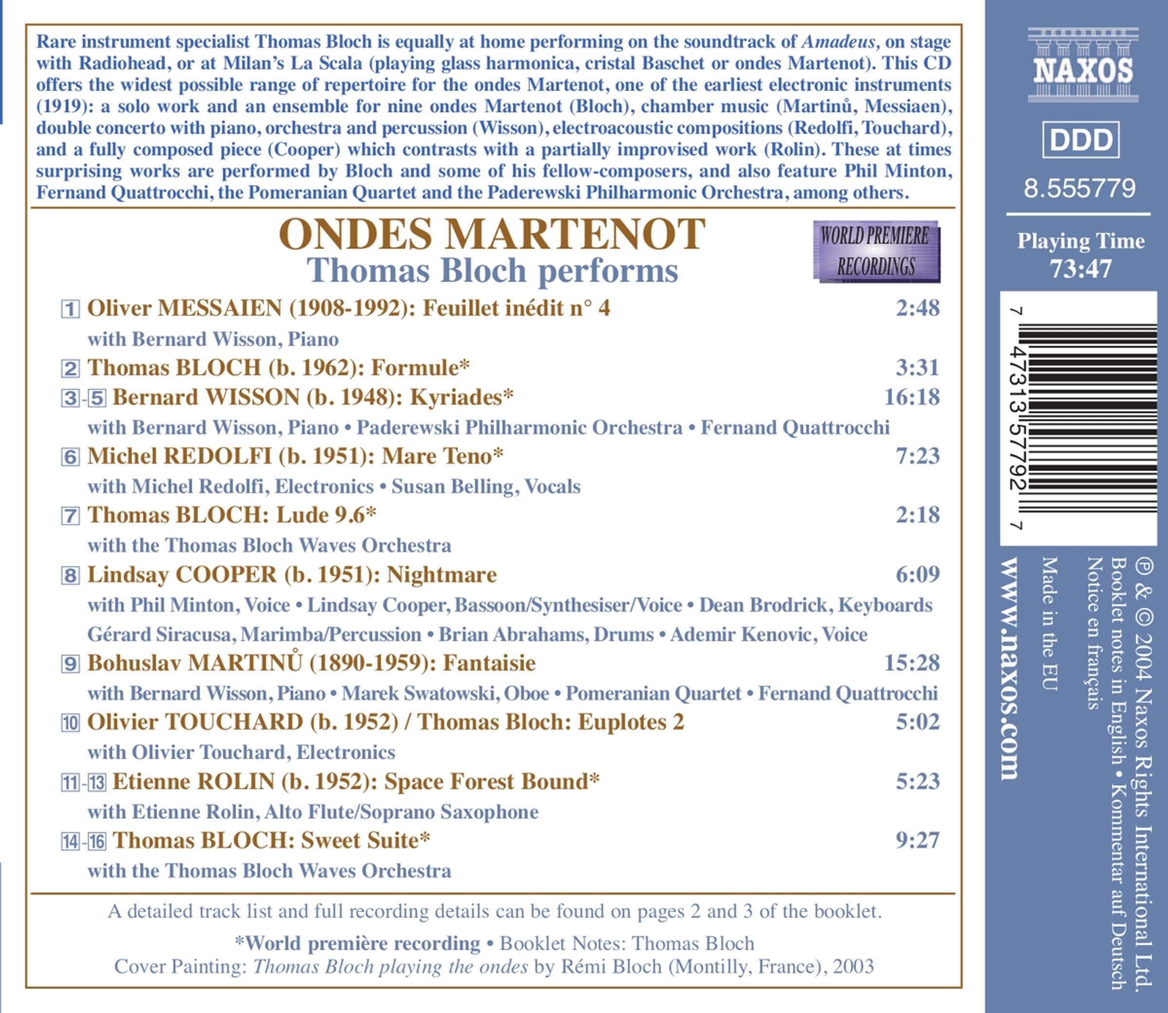 Rare instrument specialist Thomas Bloch is equally at home performing on the soundtrack of Amadeus, on stage with Radiohead, or at Milan's La Scala (playing glass harmonica, cristal Baschet or ondes Martenot). This CD offers the widest possible range of repertoire for the ondes Martenot, one of the earliest electronic instruments (1919): a solo work and an ensemble for nine ondes Martenot (Ernest Bloch), chamber music (Martinu, Messiaen), double Concerto with piano, orchestra and percussion (Bernard Wisson), electroacoustic compositions (Michel Redolfi, Olivier Touchard), and a fully composed piece (Cooper) which contrasts with a partially improvised work (Etienne Rolin). These at times surprising works are performed by Bloch and some of his fellow-composers, and also feature Phil Minton, Fernand Quattrocchi, the Pomeranian Quartet and the Paderewski Philharmonic Orchestra, among others.