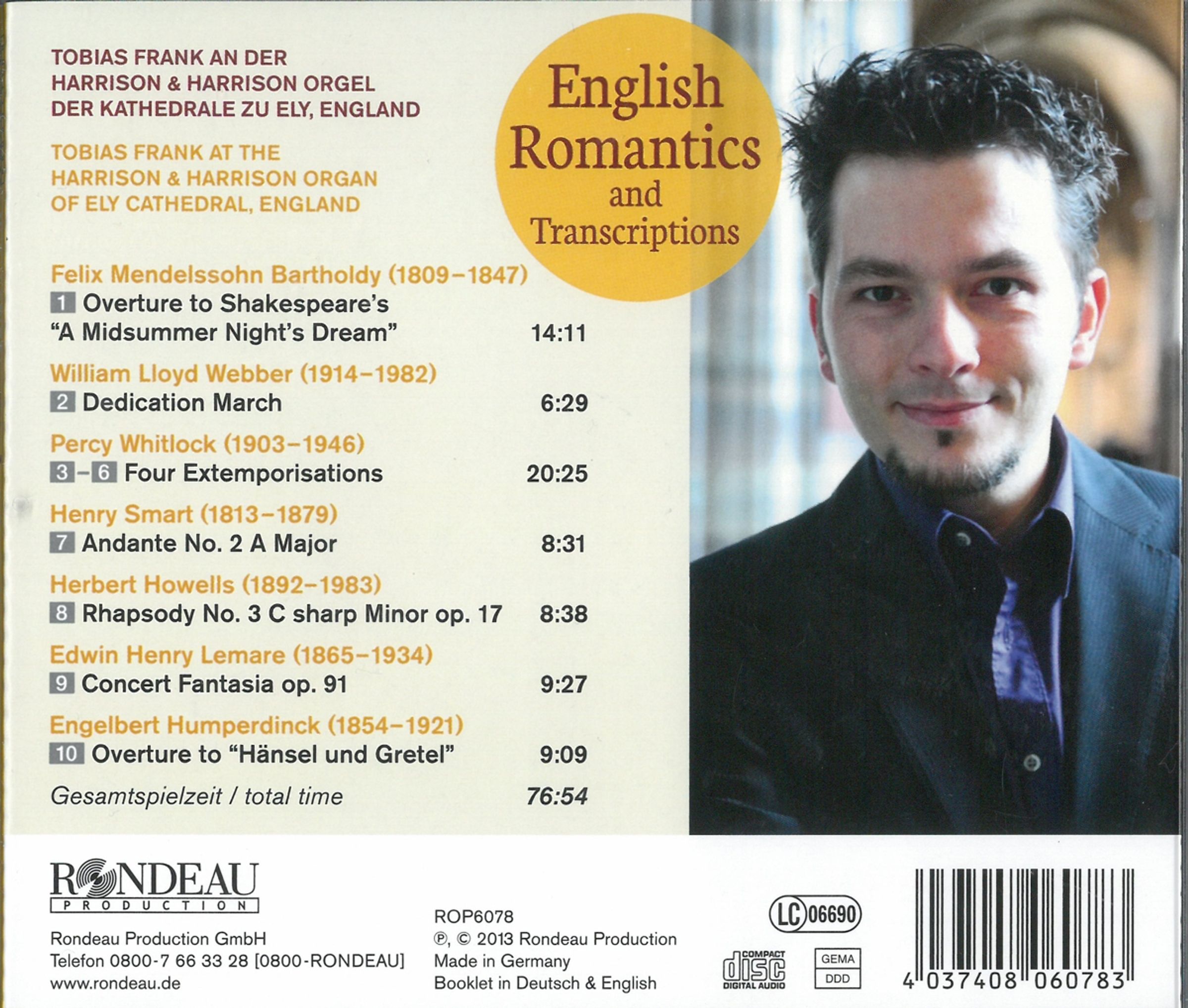 - Der junge deutsche Organist Tobias Frank hat an der opulent besetzten englisch-orchestralromantischen Orgel der Kathedrale von Ely eine brillante, effekt- wie liebevoll eingespielte CD mit Musik dieser Zeit aufgenommen