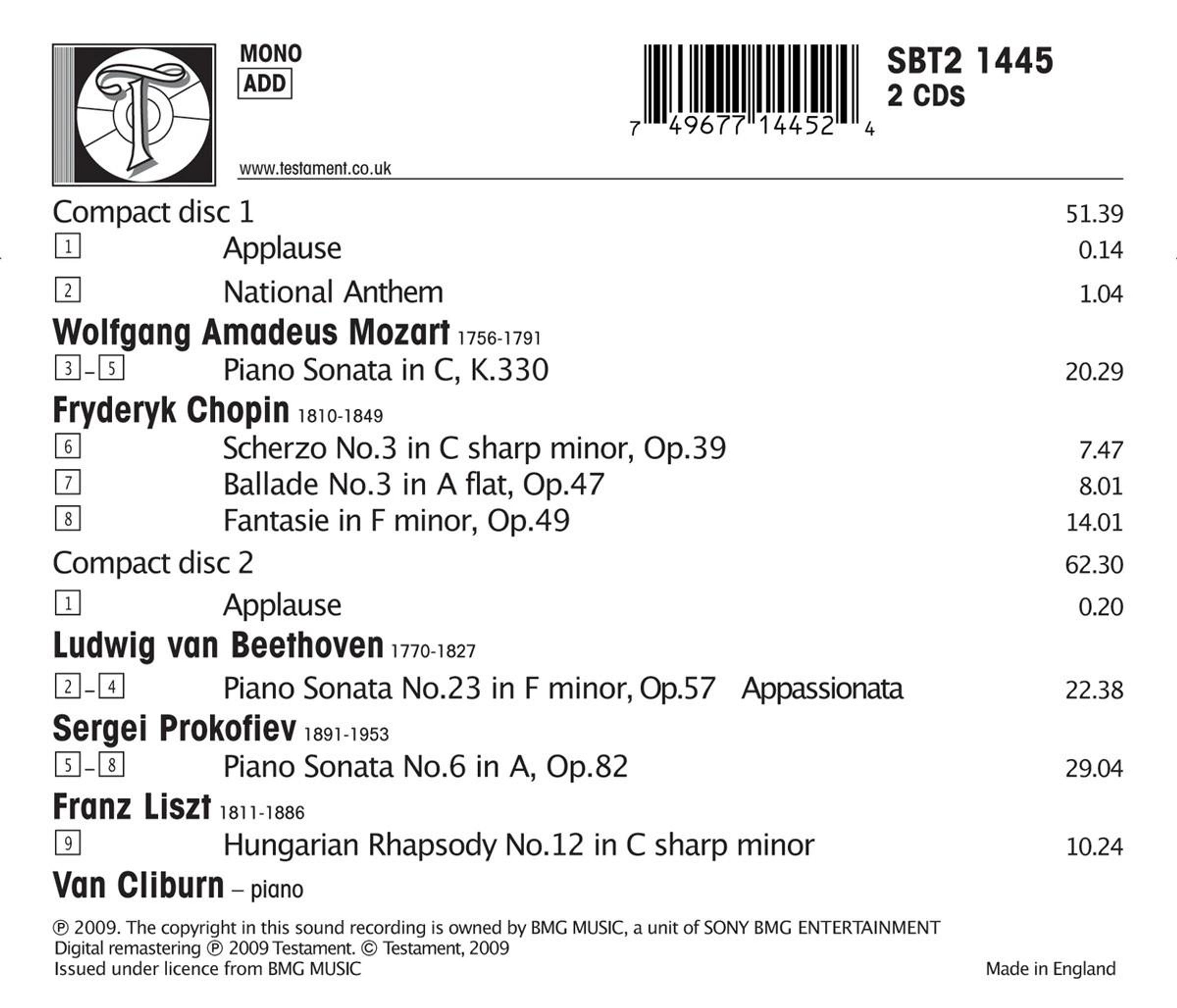 1958 schrieb Van Cliburn sozusagen Musikgeschichte, als er 23jährig auf dem Höhepunkt des Kalten Krieges in Moscow den ersten Tschaikowsky-Wettbewerb gewann und zu einer solch berühmten und charismatischen Figur avancierte, wie man sie seit den Tagen eines Franz Liszt oder Ignaz Paderewski nicht mehr erlebt hatte. Nicht weniger bemerkenswert war das einzige Londoner Solokonzert, das Van Cliburn ein Jahr später in der Royal Festival Hall gab. Dass der junge amerikanische Pianist in der kurzen Zeit seiner Karriere als einzigartig und als größte pianistische Naturbegabung seiner Generation anzusehen war, wird durch den jetzt erstmalig auf Tonträger erhältlichen Mitschnitt des Konzerts nur noch einmal unterstrichen.