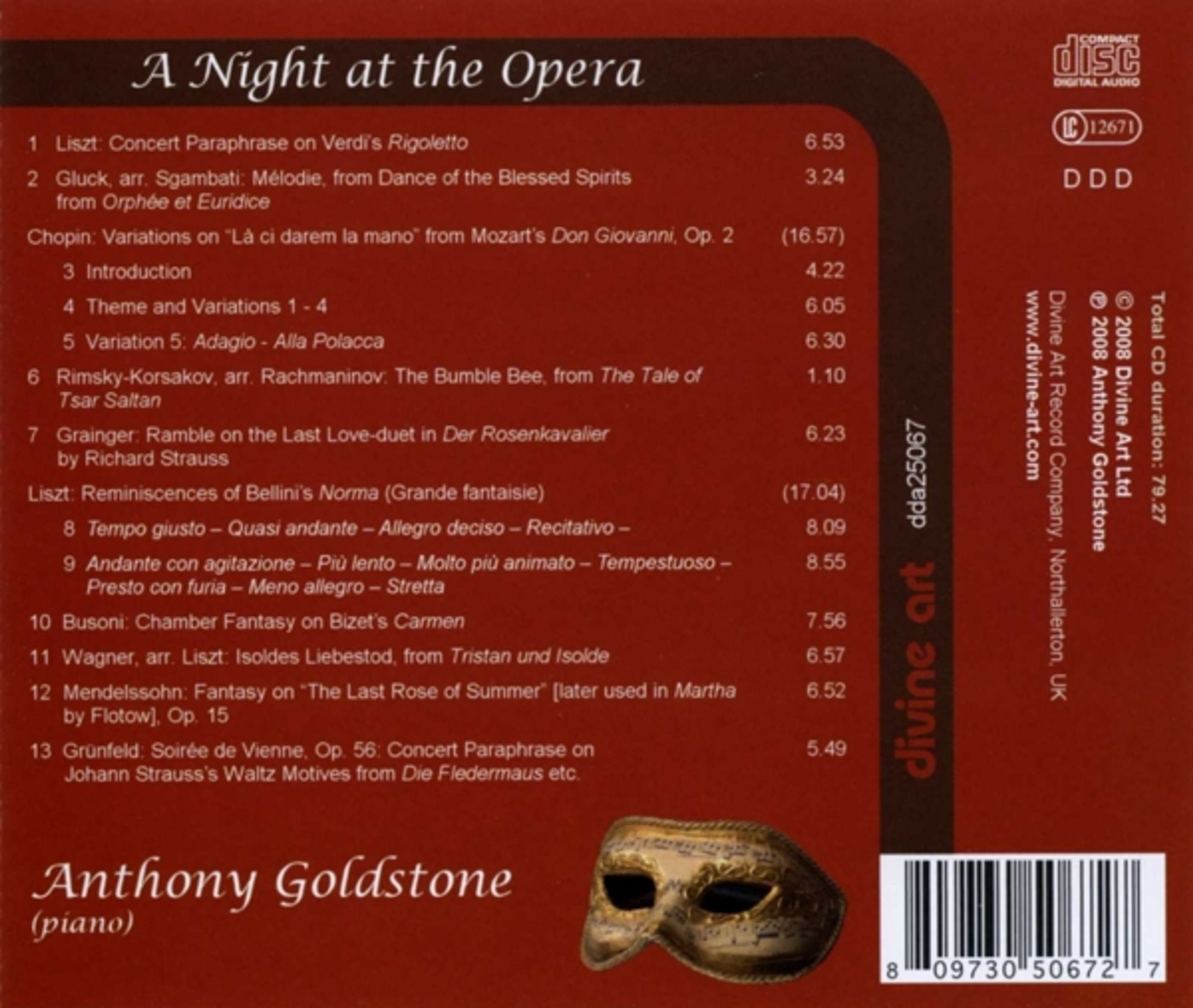 Paraphrasen, Transkriptionen und Variationen von Opernthemen für Klavier solo. Einige bekannte Stücke und einige sehr seltene Stücke, alle atemberaubend aufgeführt und ein wunderbares Programm voller Genüsse. Hören Sie sich auch unbedingt Anthony Goldstones Begleit-CDs The Piano at the Ballet, Piano at the Ballet Volume 2 und The Piano at the Carnival an.