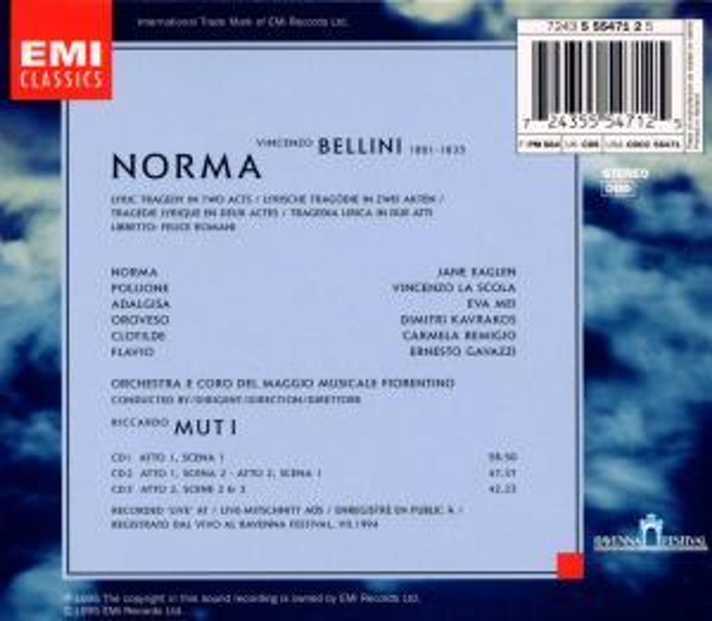 E. Bezold in Stereo 10/95: »CD des Monats. Jane Eaglen ist ein Stimmkaliber ohne jeden Zweifel. Und ist auch weit davon entfernt, die Koloraturen zum bloßen Ziergesang verkommen zu lassen. Mit musikdramatischem Gespür und großem Stimmvolumen verdeutlicht sie den Zwiespalt der Norma zwischen ihrem privaten Streben nach Glück. Die der Rolle innewohnende Tragik erfüllt die Eaglen mit beeindruckender Ausdrucksintensität.«Tracklisting