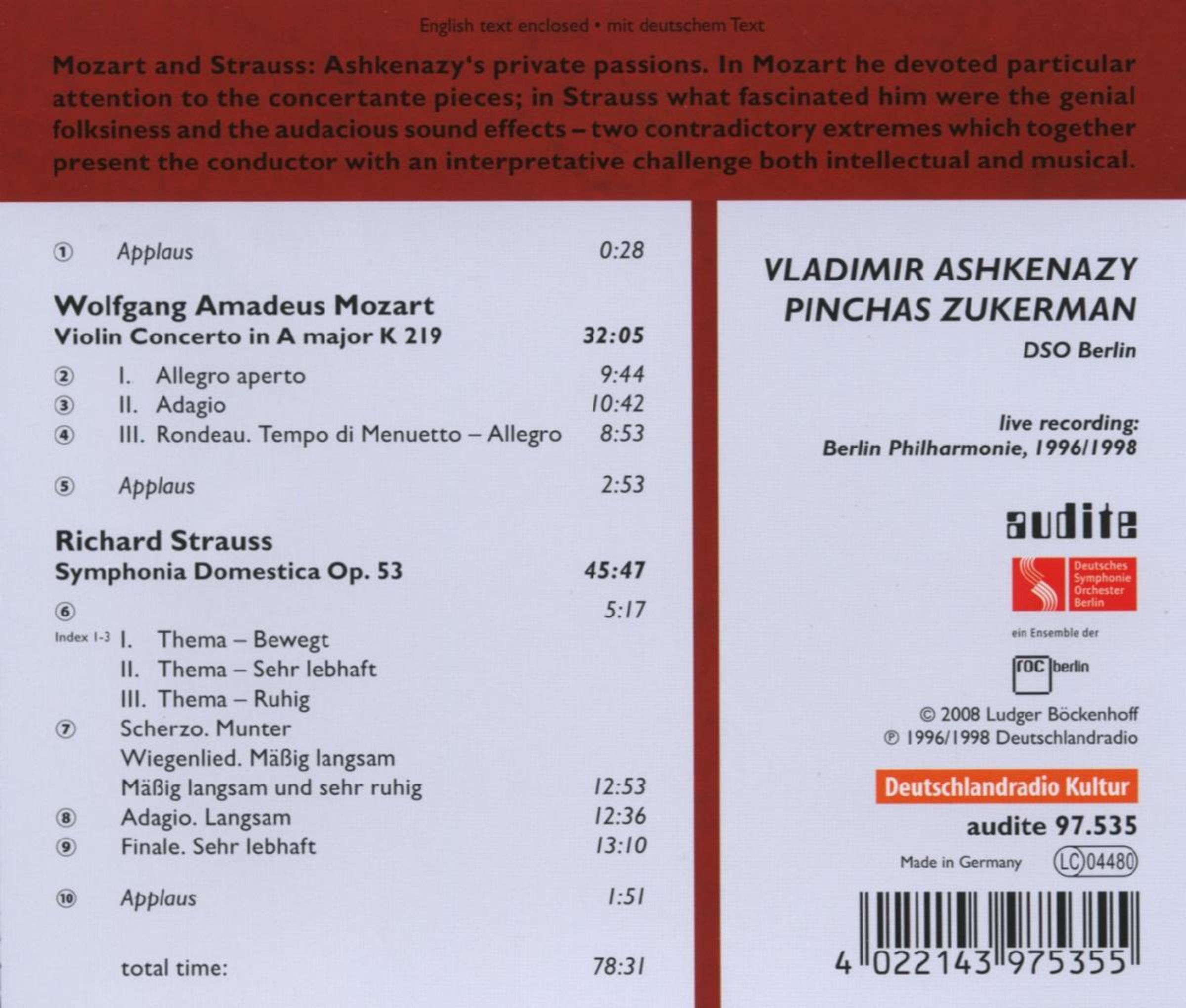 Mozart and Strauss were Ashkenazy's private passions - he felt a deep affection for them. In Mozart he devoted particular attention to the concertante pieces, in Strauss what fascinated him were the extreme polarities: simplicity versus great complexity, folksiness versus anarchic avant-garde sound effects, the contrast between programme music and abstract music. This presented Ashkenazy with a fascinating interpretative challenge both intellectual and musical. The programme of the Symphonia domestica depicts a day (including night and love) in the life of the Strauss family, painted on a broad symphonic canvas. However, Ashkenazy explored the work as music per se for him the programme was of secondary importance, merely throwing a little light on the composer's personality. That music has meaning in its abstract configurations was obvious to him from very early on. The performance of Mozart's A major Violin Concerto K 219 reveals the full extent of the unsual strong musical chemistry between Pinchas Zukerman and Vladimir Ashkenazy: Soloist and conductor perform on the basis of a totally shared concept of the work. This is no surprise: Zukerman and Ashkenazy knew each other well, frequently playing chamber music together during the 1990s. Vladimir Ashkenazy was the chief conductor of what is now the Deutsches Symphonie-Orchester Berlin from 1989 to 1999. This CD brings together live concert recordings made during the middle of his tenure and in his last season with the orchestra.