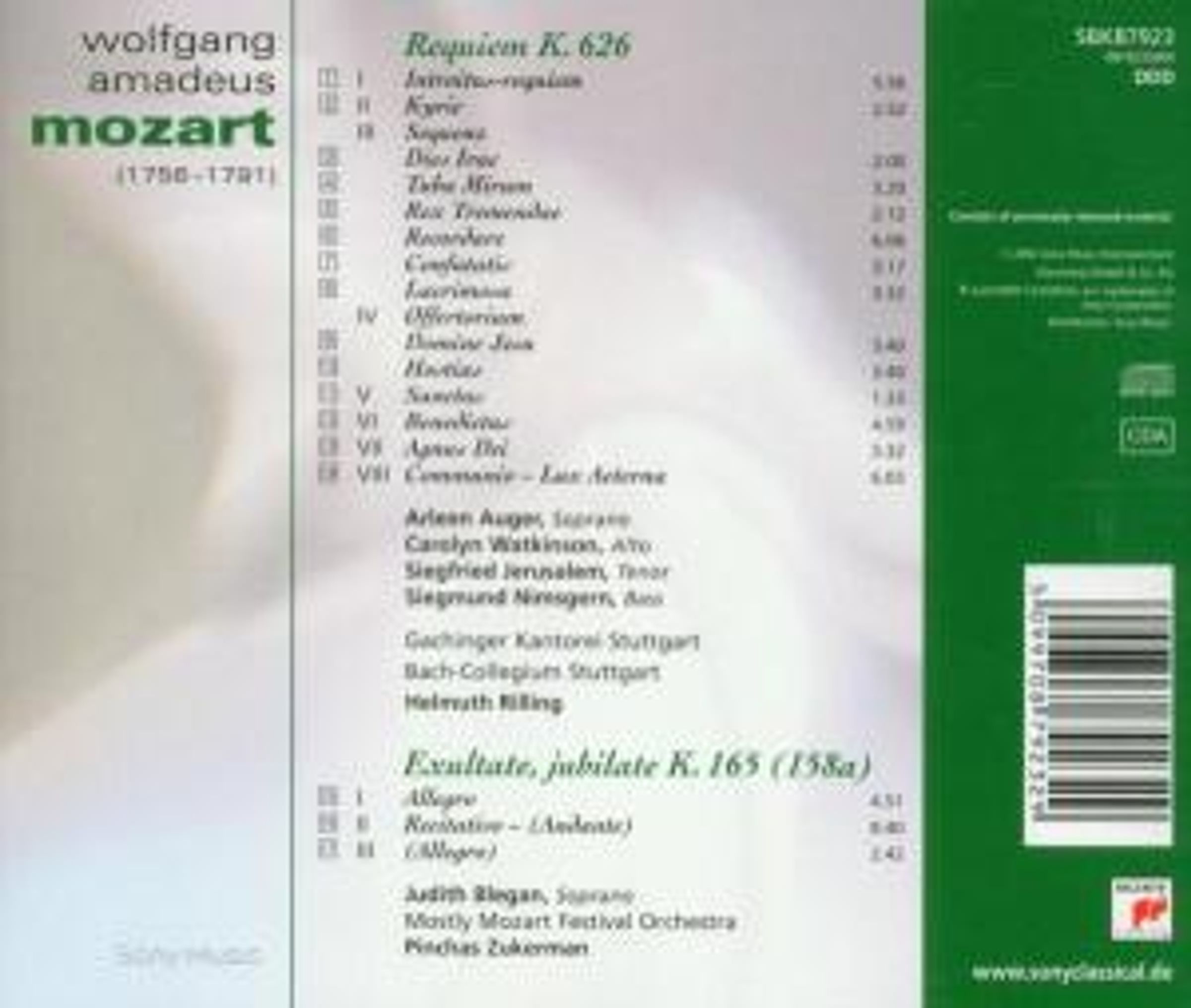 - Arleen Auger, Siegfried Jerusalem, Siegmund Nimsgern, Gächinger Kantorei Stuttgart, Bach-Collegium Stuttgart, Helmuth Rilling (KV 626); Judith Blegen, Mostly Mozart Festival Orchestra, Pinchas Zukerman