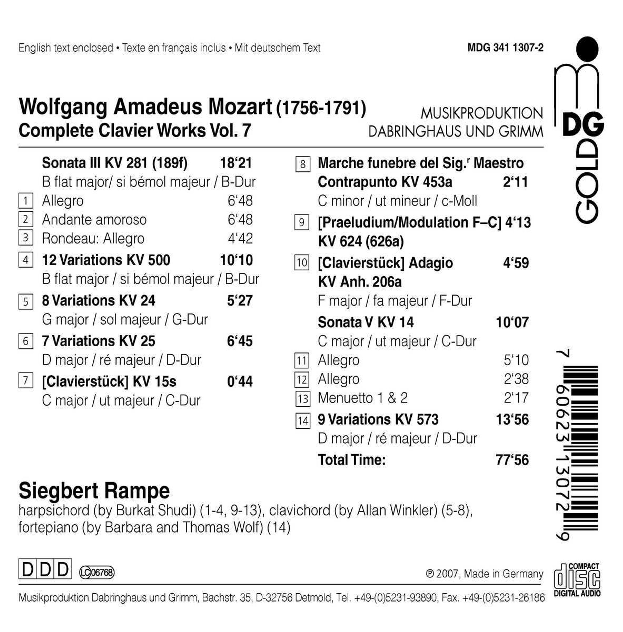 Klaviersonate Nr. 3; 12 Variationen KV 500; 8 Variationen KV 24; 7 Variationen KV 25; Clavierstück KV 15s; Marche funebre del Sig.' Maestro Contrapunto KV 453a; Präludium KV 624; Adagio KV Anh. 206a; Sonate KV 14; 9 Variationen KV 573