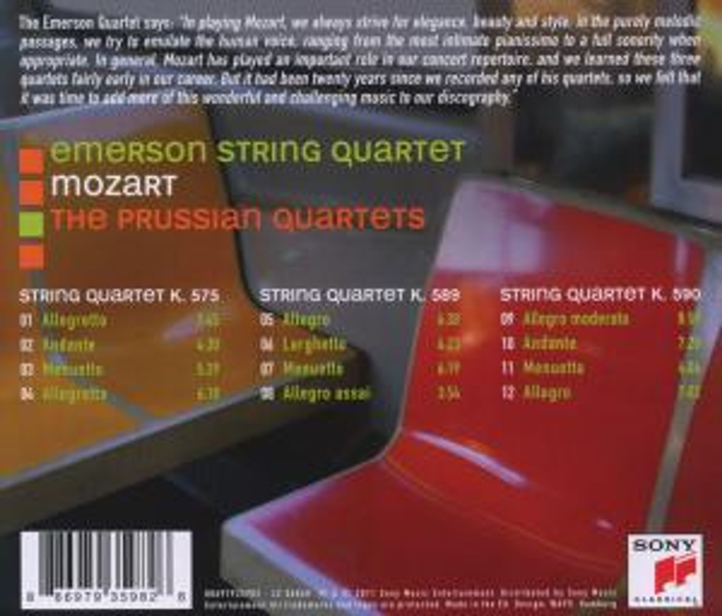 Gramophone Awards) ausgezeichnete Emerson String Quartett hat sich für ihre erste CD bei Sony Classical die letzten drei Streichquartette von Wolfgang Amadeus Mozart ausgesucht, die sogenannten »Preußischen Quartette«, Köchelverzeichnis 575, 589 und 590. Mozart hatte diese Quartette für den Preußenkönig Wilhelm II geschrieben, der er 1789 in Berlin besucht hatte und der ihn bat, Quartette zu schreiben, in denen dem Cello eine besondere Rolle zukam.