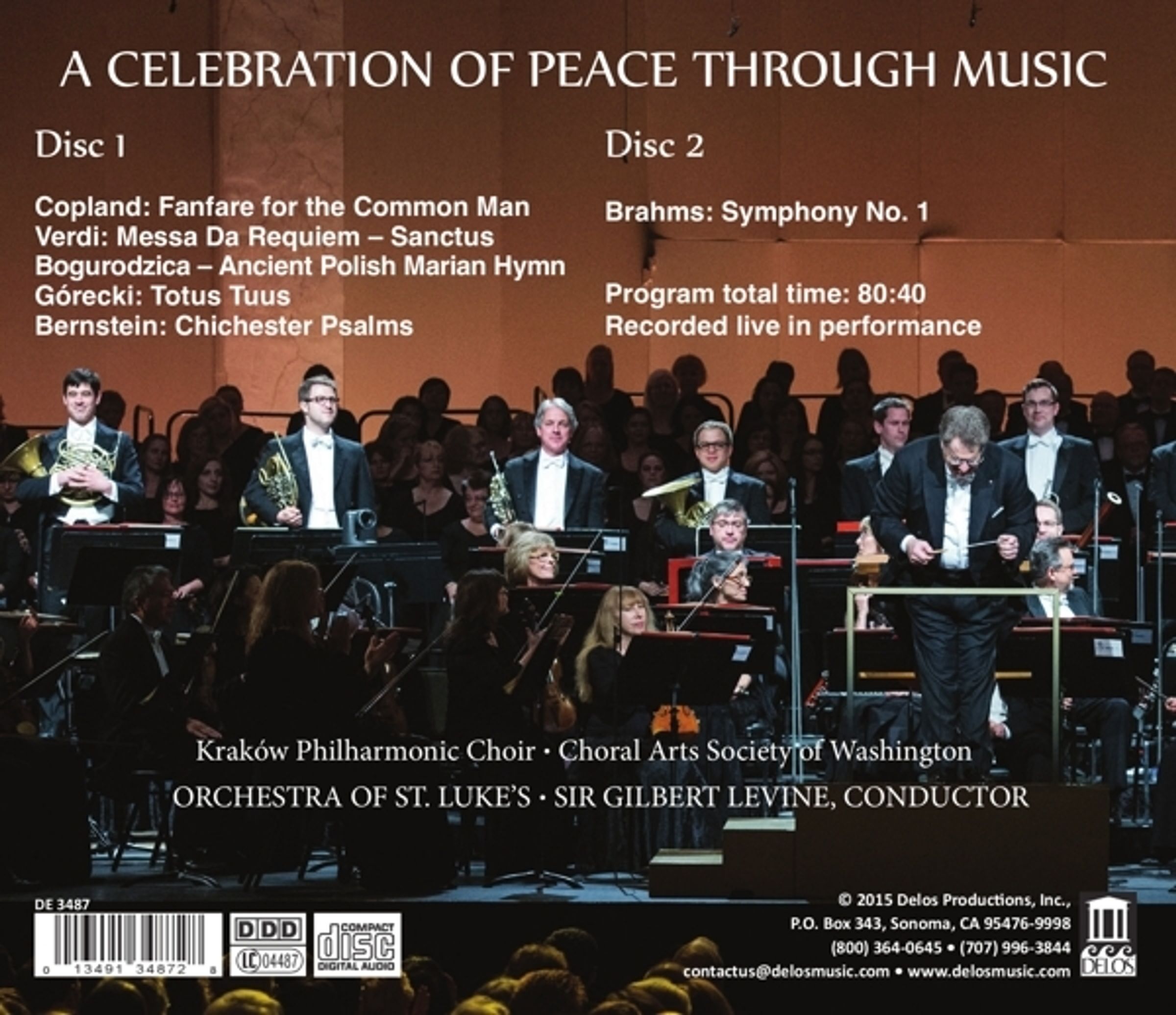 Das friedensbezogene Programm umfasst bekannte Musik von Copland, Verdi, Górecki, Bernstein und Brahms. Diese Meisterwerke wurden sorgfältig aufgezeichnet und gefilmt, um sie bis 2017 wiederholt in den großen Metropolen des nationalen Rundfunksenders PBS (auch in Europa) auszustrahlen. Sie sind in glühenden Interpretationen des gerühmten Orchestra of St. Luke's sowie der beiden hervorragenden Chöre der Krakauer Philharmoniker und der Choral Arts Society of Washington zu hören.