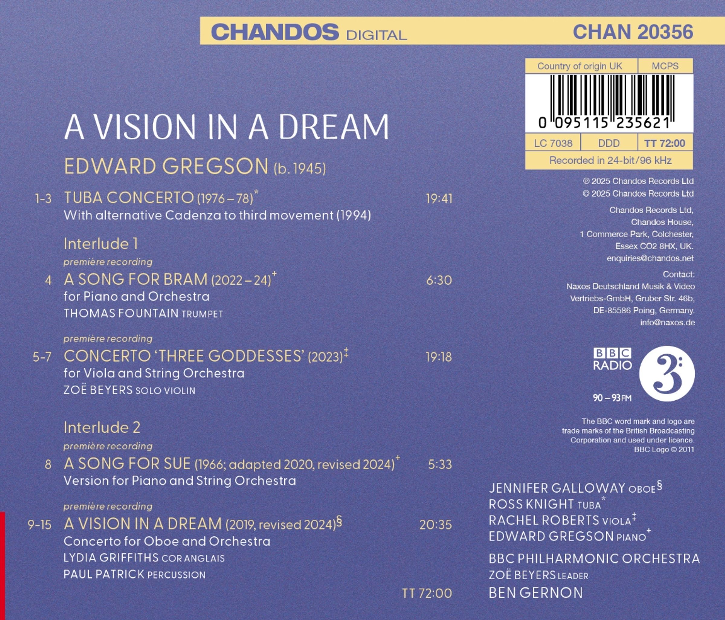 - Edward Gregson (Klavier), Jennifer Galloway (Oboe), Ross Knight (Tuba), Rachel Roberts (Viola), BBC Philharmonic Orchestra, Ben Gernon