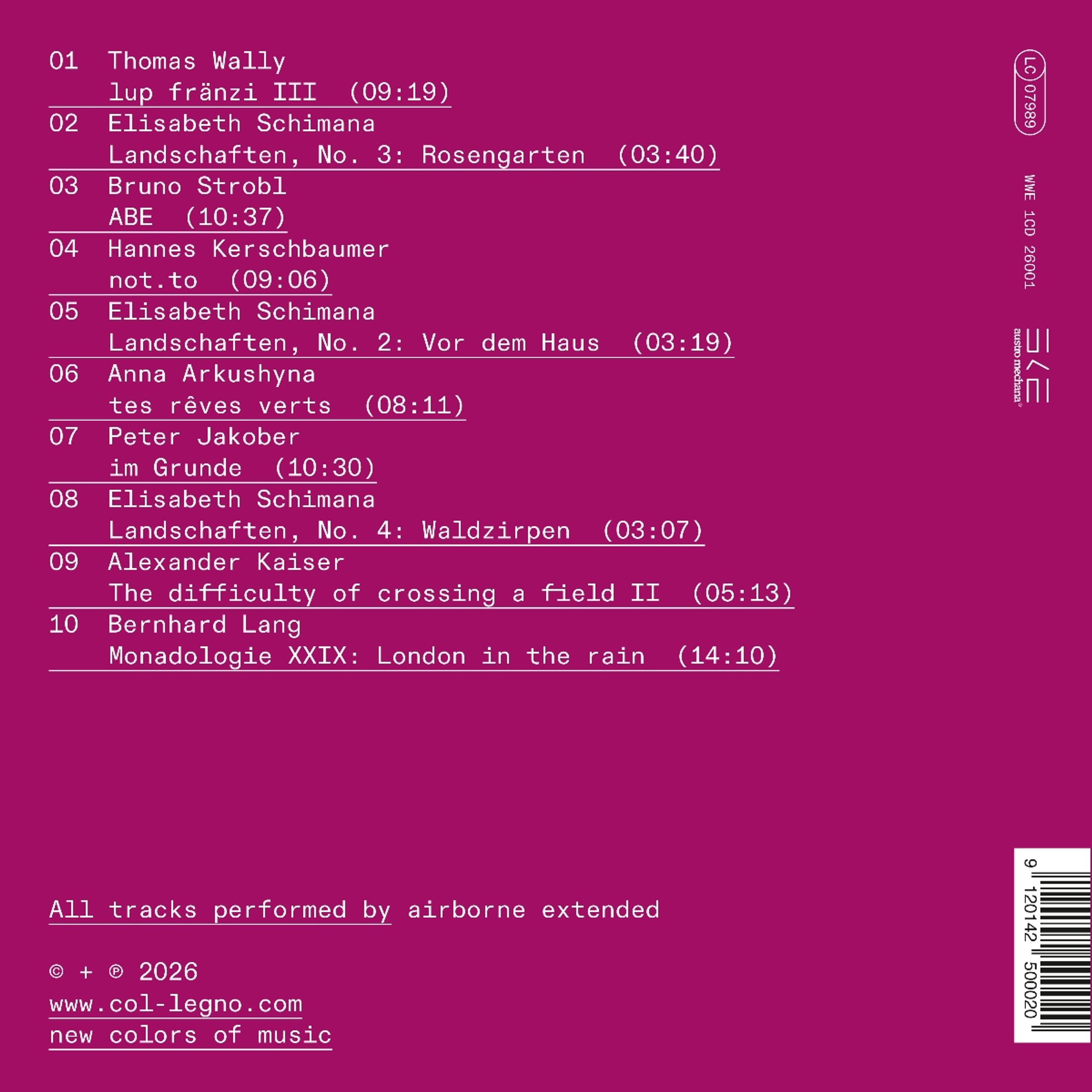 Text: "col legno", "airborne extended Landschaften". Lila Hintergrund mit orangefarbenem Rechteck., CD