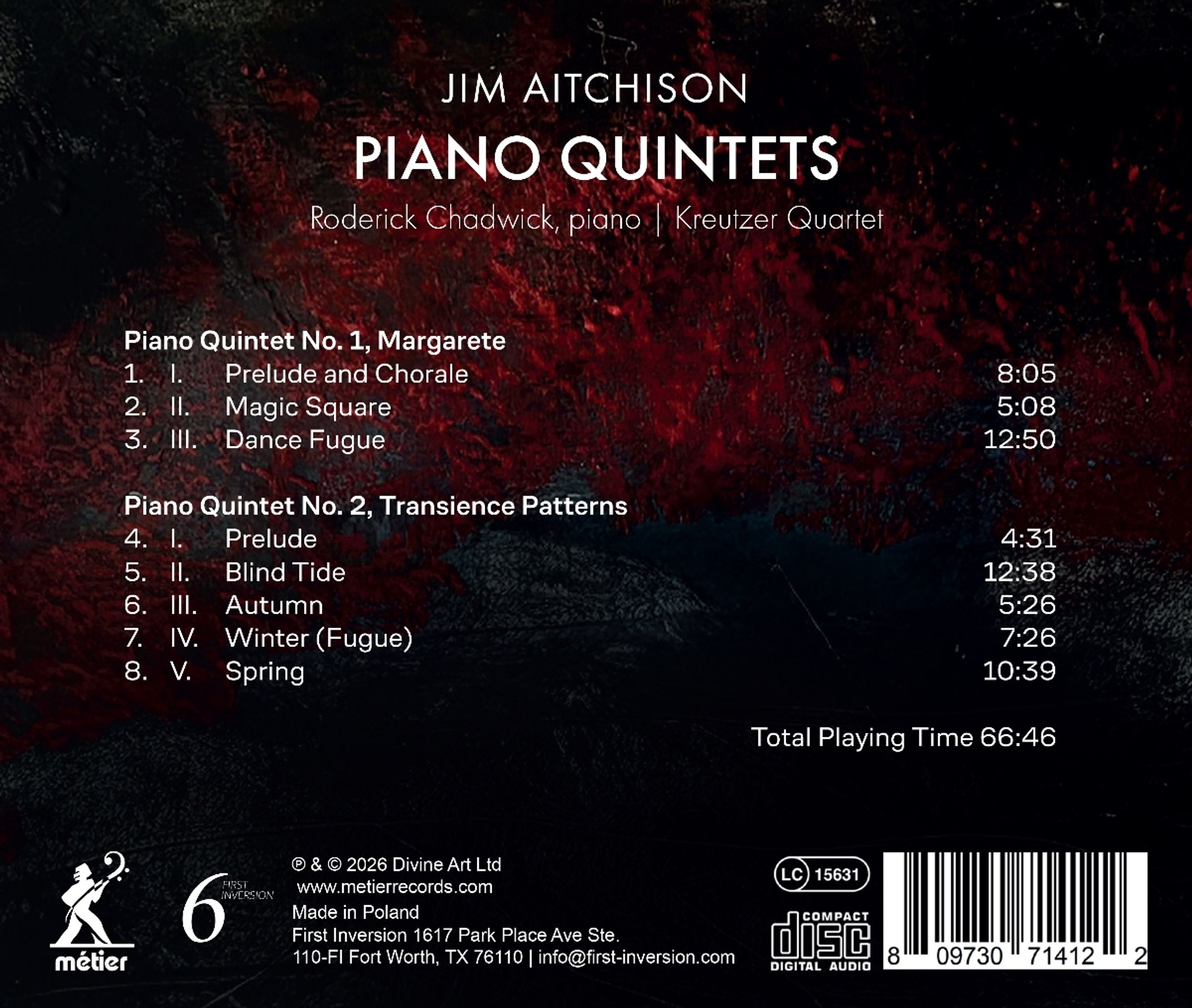 Diese Veröffentlichung enthält zwei Klavierquintette des Komponisten Jim Aitchison, die beide auf seiner ungewöhnlichen Kopplung zweier Künste basieren, denn er ist sowohl Komponist als auch bildender Künstler. Mit seiner Musik reagiert er oft auf Werke seiner Künstlerkollegen. Die vorliegenden Werke entstanden im Rahmen eines Projekts mit den Tremenheere Sculpture Gardens, »Hearing Shadows Wordless Light«. Beide Klavierquintette basieren auf seiner engen Zusammenarbeit mit Peter Sheppard Skærved, Roderick Chadwick und dem Kreutzer Quartett, deren hochintelligentes Engagement und einzigartige Erfahrung in der Arbeit im Kontext der bildenden Kunst einen Großteil von Aitchisons Werk in den letzten zwei Jahrzehnten geprägt haben. Aitchison war schon immer fasziniert von Kammermusik für Klavier und Streicher, inspiriert vom Zusammenspiel von Textur und Klangfarbe und dem enormen Ausdrucksspektrum der großen Meisterwerke. Seine eigenen Klavierquintette sind erstaunlich und unerwartet, sie erschaffen den deutschen Kanon neu und »brechen gleichzeitig seine Mauern ein«. Keines der Quintette versucht, die Kunstwerke zu vermitteln, zu »erklären« oder zu illustrieren. ›Vielmehr handelt es sich um eine Erkundung von Territorium, das in mir provoziert und offenbart wird: Ich reagiere nicht direkt auf die Kunstwerke selbst, sondern eher auf die Bandbreite meiner eigenen Reaktionen, die sich aus ihrer Erfahrung ergeben» sagt der Komponist. Er hat mit einer Reihe von international bedeutenden bildenden Künstlern wie Gerhard Richter zusammengearbeitet und mit verschiedenen Galerien wie der Tate Modern. Diese Veröffentlichung ist das 50. gemeinsame Album von Peter Sheppard Skaerved und dem Kreutzer Quartett auf den Labels Divine Art, Metier und Athene.