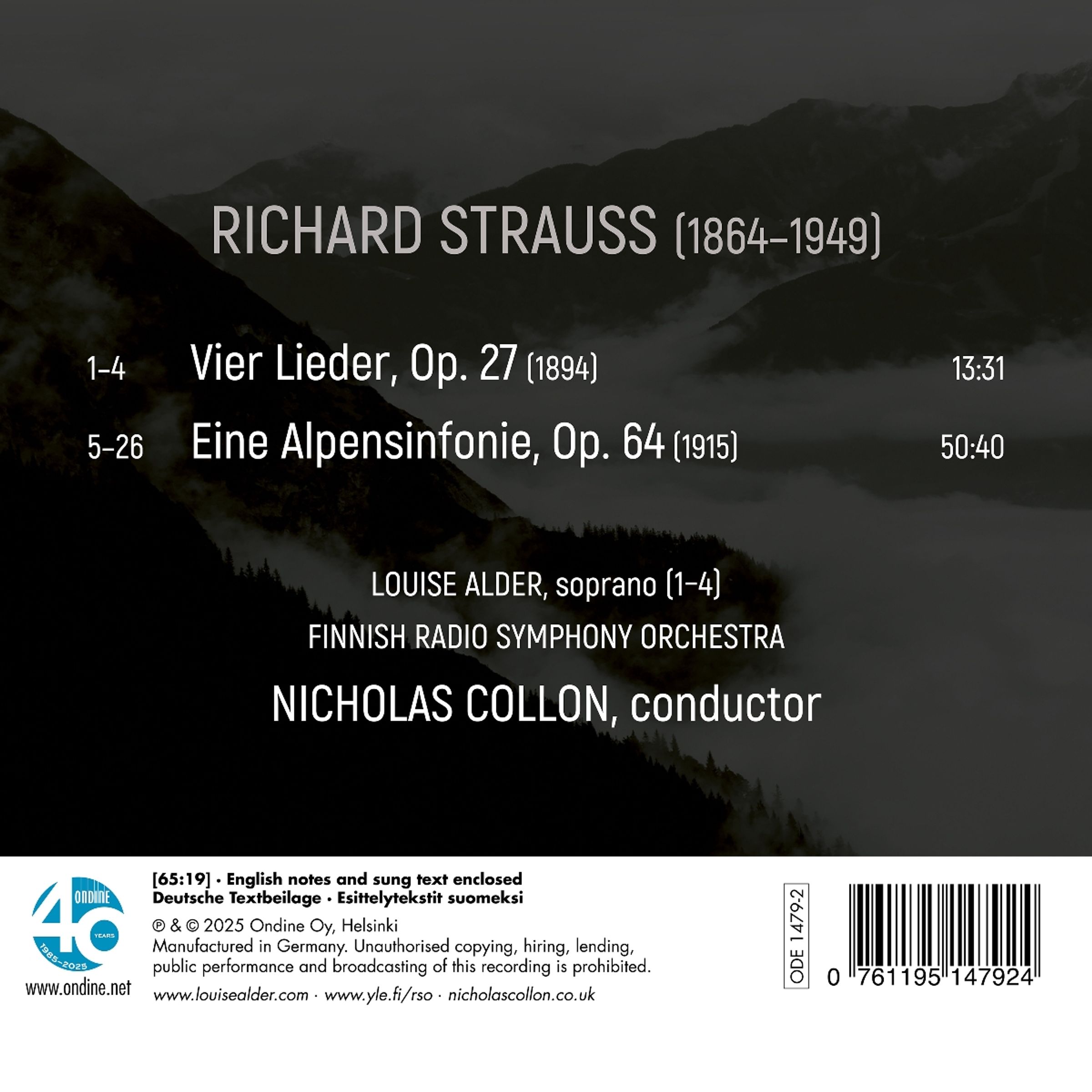 Das Finnische Radio-Sinfonieorchester und Dirigent Nicholas Collon setzen ihre Reihe mit einem neuen Album mit Orchesterwerken von Richard Strauss (1864-1949) fort. Es enthalt Strauss' langstes und letztes grosses Orchesterwerk, die "Alpensinfonie", sowie "Vier Lieder", Op. 27, gesungen von der Sopranistin Louise Alder. In Erinnerung an eine Bergwanderung aus seiner Kindheit vollendete Strauss im Februar 1915 die "Alpensinfonie", die trotz