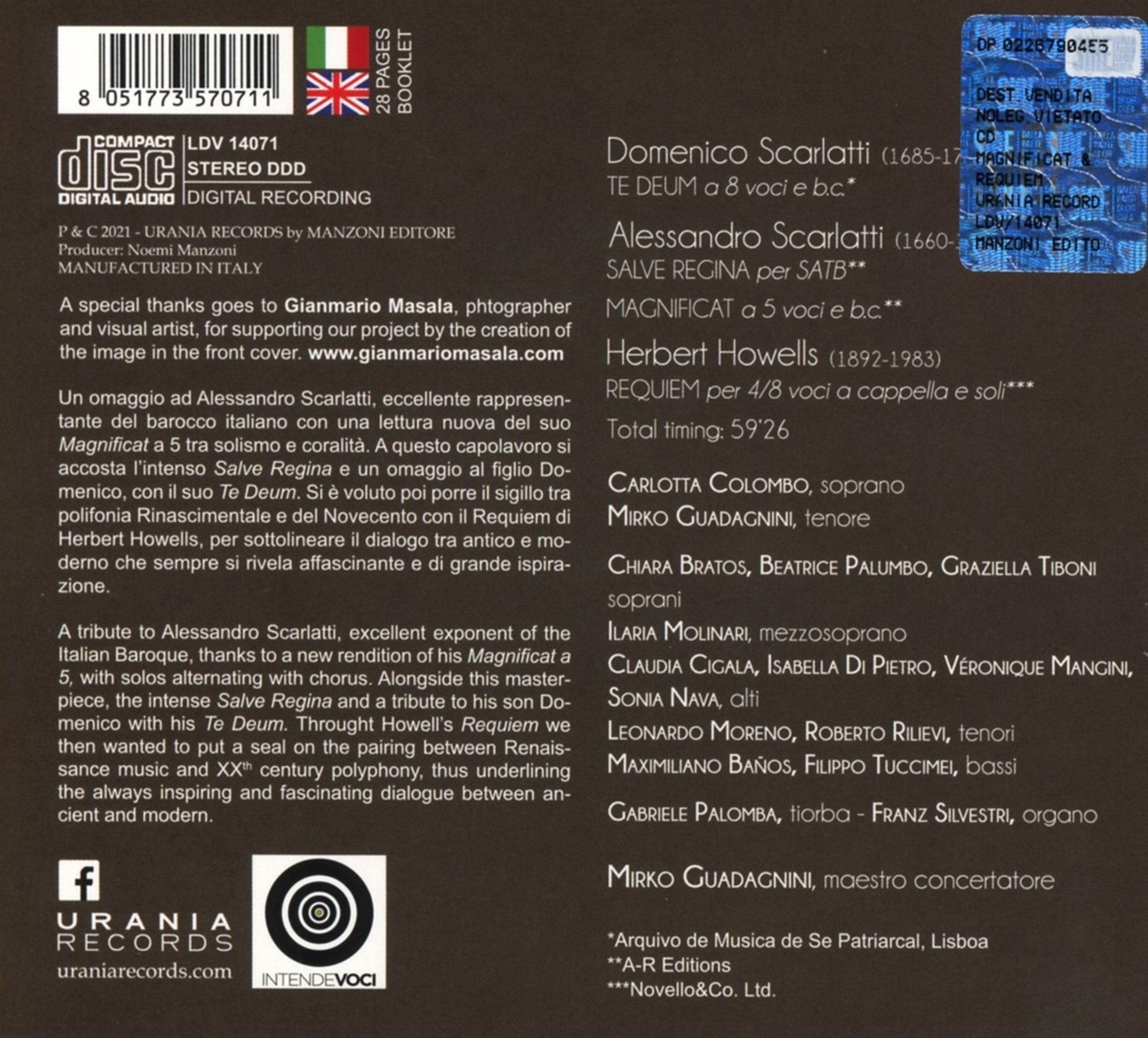 Eine Hommage an Alessandro Scarlatti, einen hervorragenden Vertreter des italienischen Barocks, mit einer neuen Interpretation seines Magnificat a 5, das vom Wechsel zwischen Soli und Chor strukturiert wird. Neben diesem Meisterwerk steht das intensive Salve Regina und eine Hommage an seinen Sohn Domenico mit seinem Te Deum. Mit Howells Requiem wird dann die Verbindung zwischen Renaissancemusik und Polyphonie des 20. Jahrhunderts aufgezeigt und so der immer inspirierende und faszinierende Dialog zwischen Alter und Neuer Musik unterstrichen.