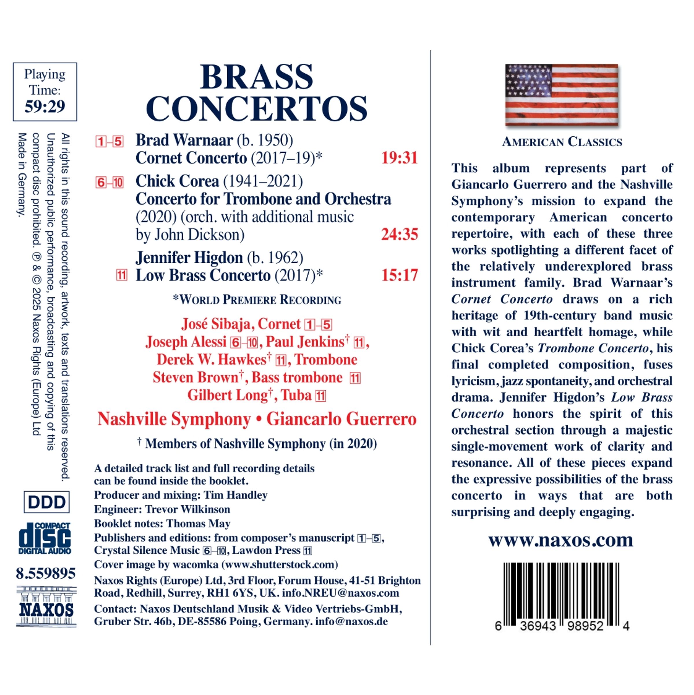 Dieses Album ist Teil der Mission von Giancarlo Guerrero und dem Nashville Symphony Orchestra, das zeitgenössische amerikanische Konzertrepertoire zu erweitern. Jedes dieser drei Werke beleuchtet eine andere Facette der relativ unbeachteten Familie der Blechblasinstrumente. Brad Warnaars Kornettkonzert greift mit Witz und herzlicher Hommage auf das reiche Erbe der Blasmusik des 19. Jahrhunderts zurück, während Chick Coreas Posaunenkonzert, seine letzte vollendete Komposition, Lyrik, Jazz-Spontaneitat und orchestrale Dramatik miteinander verbindet. Jennifer Higdons "Low Brass Concerto" oder Tiefblechkonzert würdigt den Geist dieser Orchestergruppe durch ein majestätisches einteiliges Werk von Klarheit und Resonanz. Alle diese Stücke erweitern die Ausdrucksmöglichkeiten des Blechbläserkonzerts auf überraschende und zugleich tief bewegende Weise. Die Solisten dieser Aufnahme gehören zur Spitzenklasse der Blechbläser.