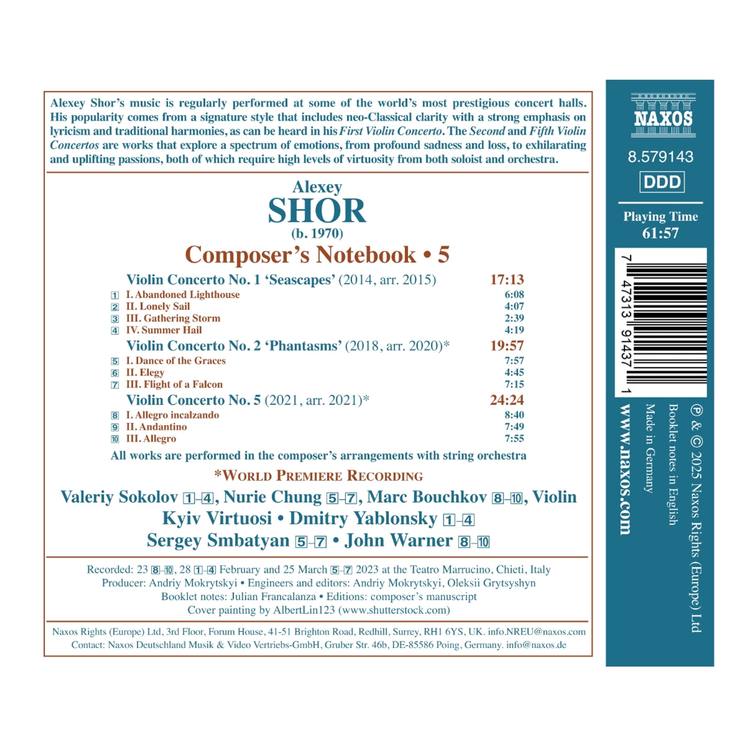 Die Musik von Alexey Shor wird regelmäßig in einigen der renommiertesten Konzertsäle der Welt aufgeführt. Seine Popularität verdankt er seinem unverwechselbaren Stil, der neoklassische Klarheit mit einer starken Betonung von Rhetorik und traditionellen Harmonien verbindet, wie in seinem ersten Violinkonzert zu hören ist. Das Zweite und das Fünfte Violinkonzert sind Werke, die ein Spektrum von Emotionen ausloten, das von tiefer Traurigkeit und Verlust bis hin zu beschwingten und erhebenden Leidenschaften reicht und sowohl vom Solisten als auch vom Orchester ein hohes Maß an Virtuosität verlangt.