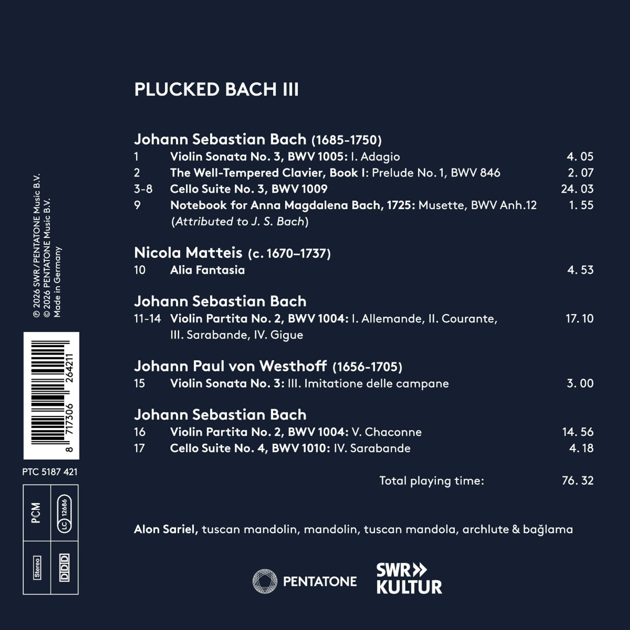 "Plucked Bach III, Alon Sariel." Mann in Anzug sitzt vor roter Steinwand, umgeben von Saiteninstrumenten., CD