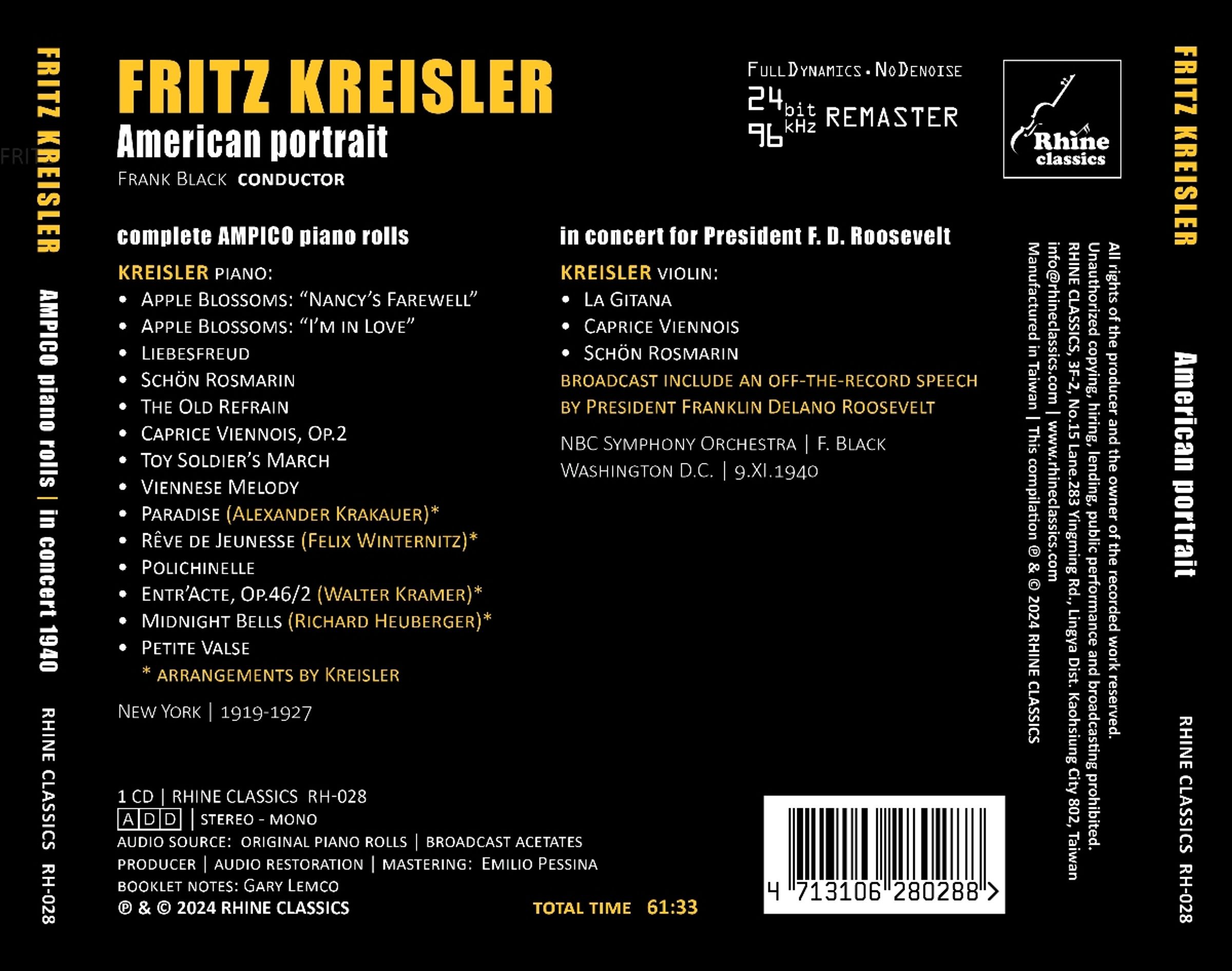 Fritz Kreisler: American Portrait - Complete Ampico Piano Rolls 1919-1927 / In Concert for President Roosevelt 1940 auf CD