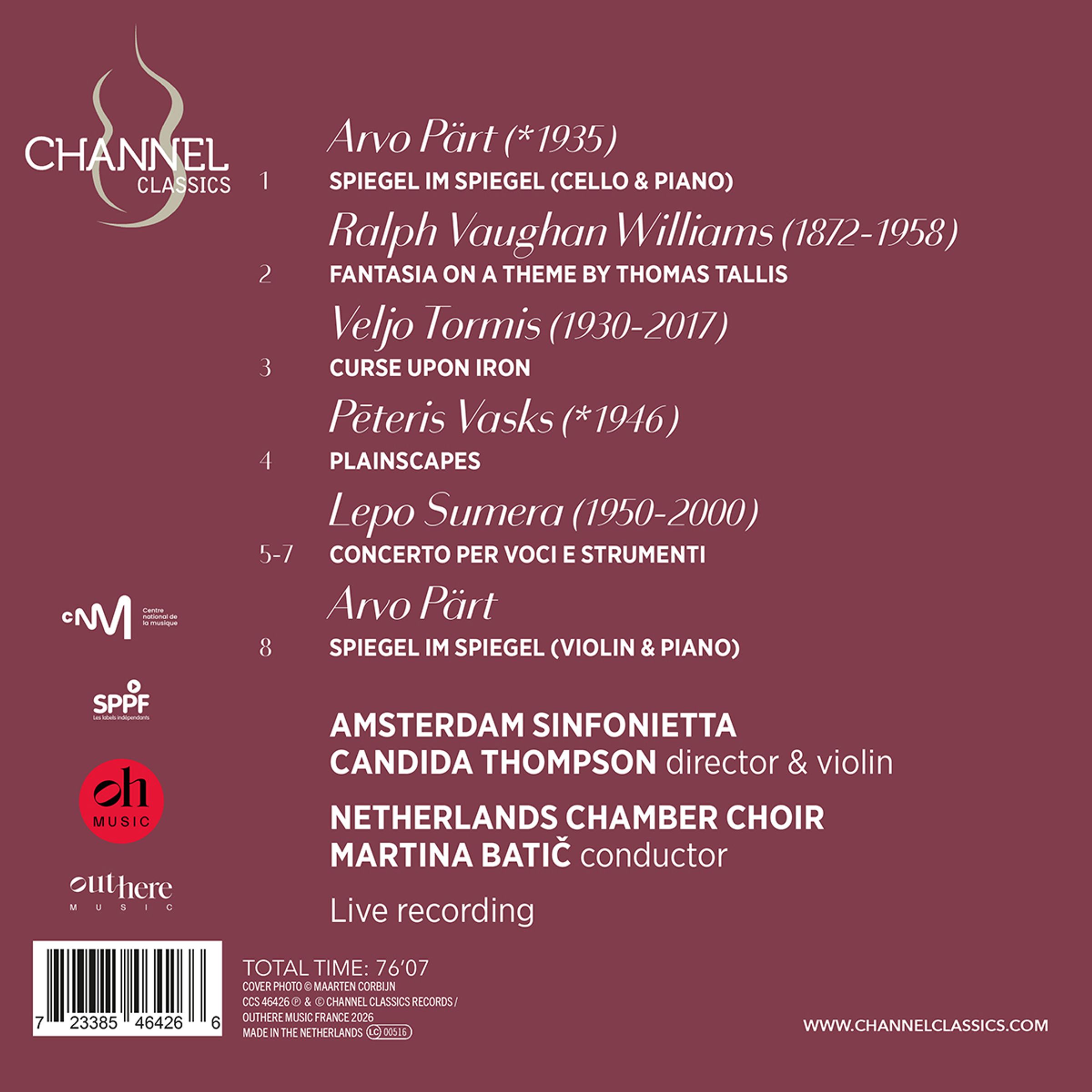 Auf »Spiegel im Spiegel« präsentieren die Amsterdam Sinfonietta, der Netherlands Chamber Choir, Candida Thompson, Martina Batič, Hülya Keser und Tim Posner ein Programm mit baltischen und englischen Kompositionen, in denen Raum und Zeit verschwimmen. Der Titel des Albums stammt von Arvo Pärts gleichnamigem meditativen Werk »Spiegel im Spiegel«, das in zwei separaten Versionen am Anfang und am Ende des Albums zu hören ist und das Konzept des Spiegels aufgreift. Ralph Vaughan Williams’ »Fantasia on a Theme by Thomas Tallis« spiegelt die Renaissance im 20. Jahrhundert wider. Werke der estnischen Komponisten Veljo Tormis und Lepo Sumera haben eine weitere spirituelle Essenz, da in Tormis’ epischem Chorwerk »Curse upon Iron« schamanistische Urschreie widerhallen. »Plainscapes« des lettischen Komponisten Pēteris Vasks erinnert an die Weiten der baltischen Ebenen.