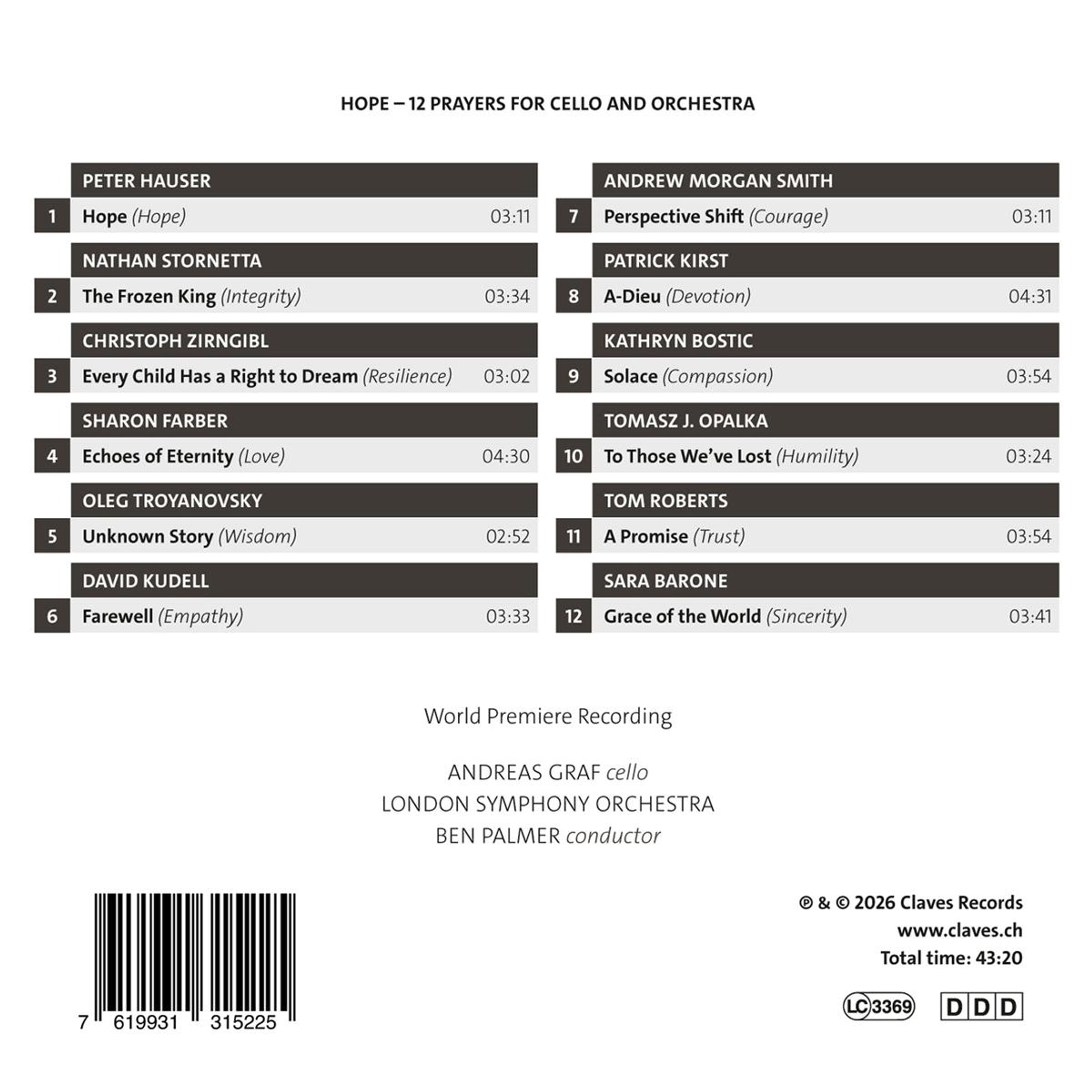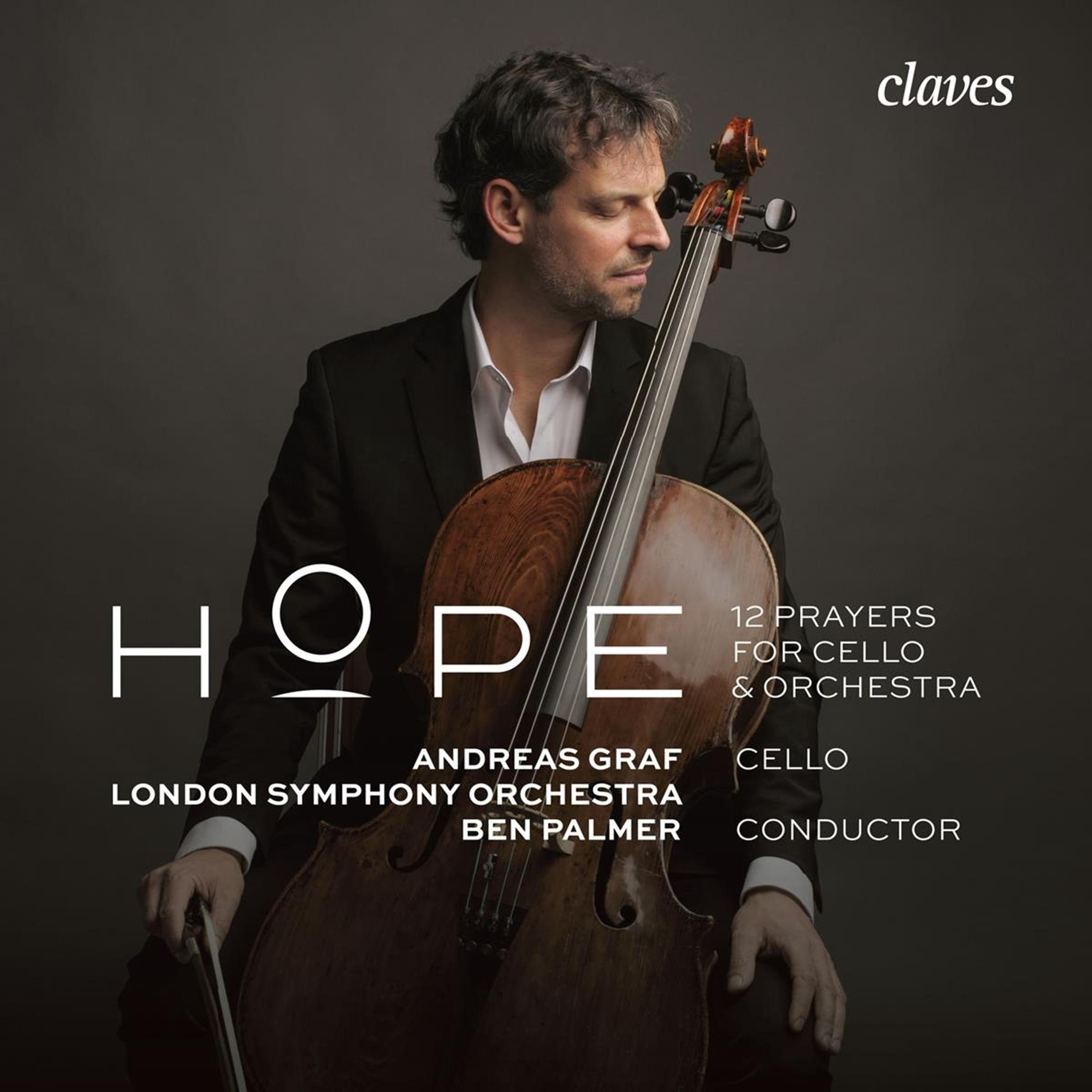„HOPE“, „12 Prayers for Cello & Orchestra“, „Andreas Graf“, „London Symphony Orchestra“, „Ben Palmer“. Cellist spielt Cello., CD