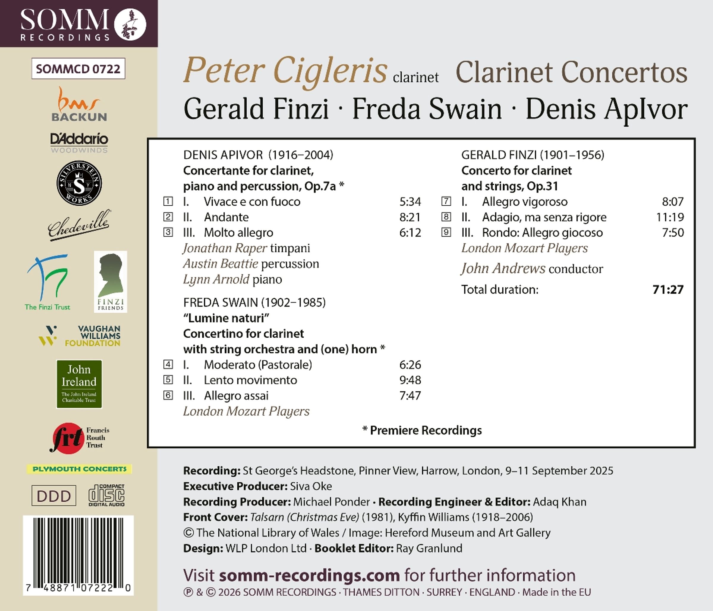 Für seine neue Veröffentlichung, die auf ein Album mit Klarinettenkonzerten folgt, bietet der Klarinettist Peter Cigleris wieder konzertante Werke an, und wieder zwei Ersteinspielungen, aber hier sind die Tutti-Truppen nicht die Bläser, sondern die leuchtenden Streicher der London Mozart Players unter der Leitung von John Andrews. Die drei Werke, die alle in den späten 40er Jahren komponiert wurden, sind durch den bedeutenden englischen Klarinettisten Frederick Thurston (1901-1953) miteinander verbunden. Denis ApIvor (1916-2004), in Irland als Sohn walisischer Eltern geboren, war Chorsänger an der Christ Church in Oxford und anschließend an der Kathedrale von Hereford, wo er auch Klarinette, Klavier und Orgel studierte. Während es eine spätere Version seiner Concertante für Klarinette gibt, die für ein Ensemble mit Streichern, Harfe und Celesta instrumentiert wurde, eröffnet Peter Cigleris dieses Album mit ApIvors ursprünglicher Kammermusikversion für Klavier und zwei Schlagzeuger (einer an der Pauke). Dieses frühe Werk entstand während des Kriegseinsatzes des Komponisten in Indien. Viele, die den Namen Freda Swain (1902-1985) kennen, werden an pädagogische Klaviersoli denken und überrascht sein, wenn sie erfahren, dass die aus Portsmouth stammende Komponistin rund 450 ernsthafte Werke geschaffen hat, darunter groß angelegte Opern-, Orchester- und konzertante Musik sowie verschiedene Kammermusikwerke, die leider viel zu lange vernachlässigt wurden. Swains »Lumine naturi« Concertino für Klarinette, das hier in einer Ersteinspielung präsentiert wird, ist ein ausdrucksstarkes Werk in einer Sprache, die sich auf die Tonalität stützt und dennoch höchst individuell und mitreißend melodisch ist. Thurston spielte die Uraufführung von Gerald Finzis (1901-1956) Konzert für Klarinette und Streicher beim Hereford Three Choirs Festival am 9. September 1949, und das Meisterwerk ist zu Recht das meistgespielte Konzertwerk des Komponisten geworden.
