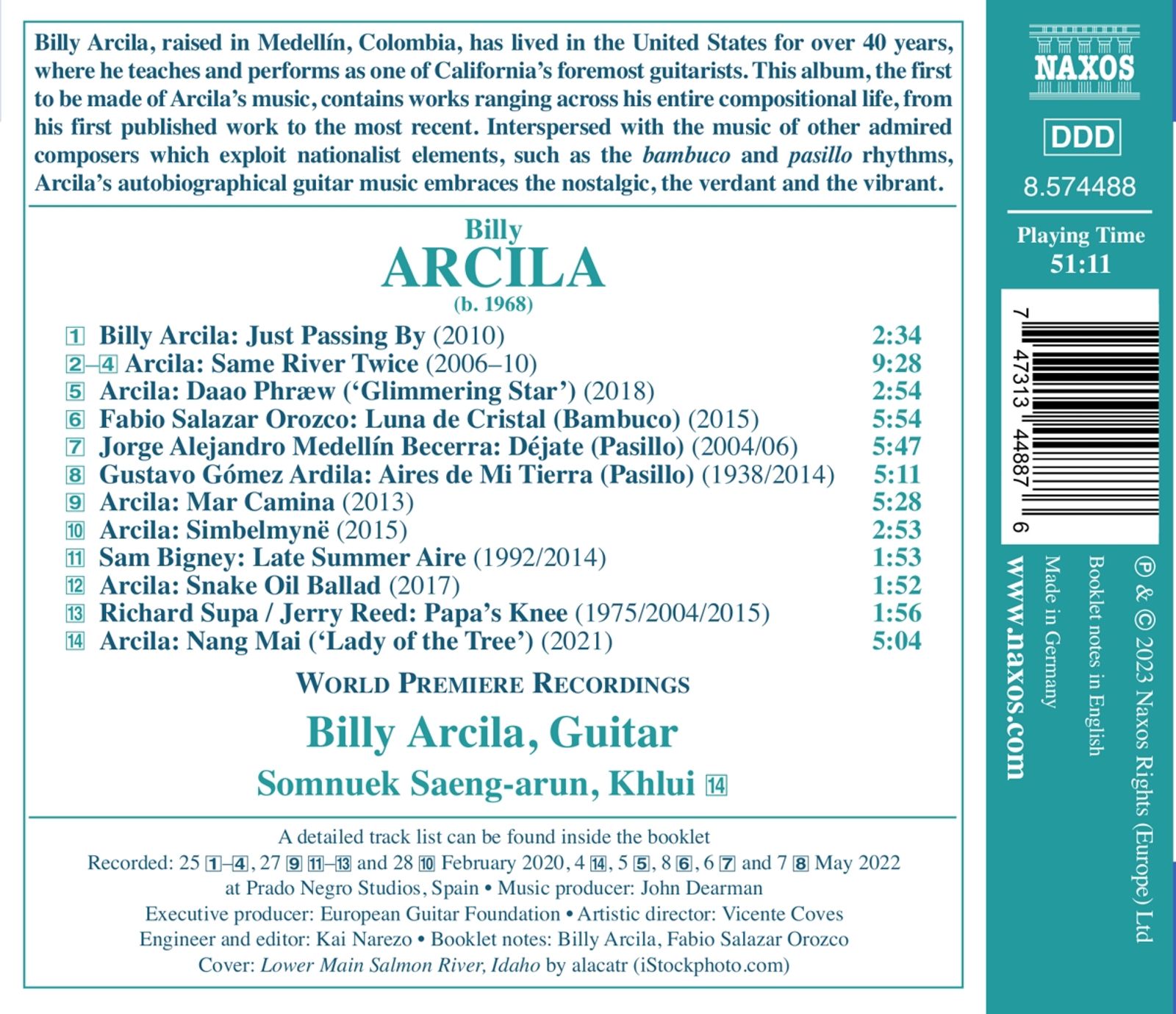 Billy Arcila, aufgewachsen in Medellín, Kolumbien, lebt seit über 40 Jahren in den Vereinigten Staaten, wo er als einer der führenden Gitarristen Kaliforniens unterrichtet und auftritt. Dieses Album, die erste Veröffentlichung von Arcilas Musik, enthält Werke aus seinem gesamten kompositorischen Schaffen, von seinem ersten veröffentlichten Werk bis hin zu seinem jüngsten. Durchsetzt mit der Musik anderer bewunderter Komponisten, die nationalistische Elemente wie den Bambuco- und Pasillo-Rhythmus verwenden, umfasst Arcilas autobiografische Gitarrenmusik das Nostalgische, das Grüne und das Lebendige.