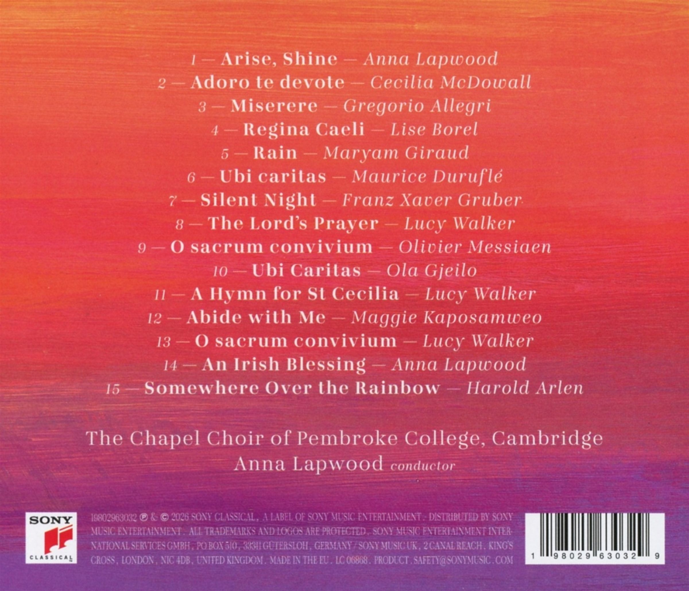 Mit dem Chapel Choir des Pembroke College aus Cambridge, einem renommierten Mädchenchor, hat sie als Leiterin zum Ende ihrer Amtszeit ein persönliches, vorwiegend geistliches Chorprogramm eingespielt, das auf spannendste Weise u. a. Werke von Maurice Duruflé und Ola Gjeilo sowie Kompositionen von Olivier Messiaen und Lucy Walker, die früher selbst in diesem Chor sang, kontrastierend gegenüberstellt. Eine besondere Zugabe ist »Somewhere Over The Rainbow« aus dem Filmklassiker »The Wizard of Oz«. Außerdem hat Anna Lapwood zwei Werke selbst komponiert. Mit dieser typischen Bandbreite von klassischen und zeitgenössischen Titeln, sowie einer Portion Filmmusik, bleibt sich Anna Lapwood auf beeindruckende Weise treu.