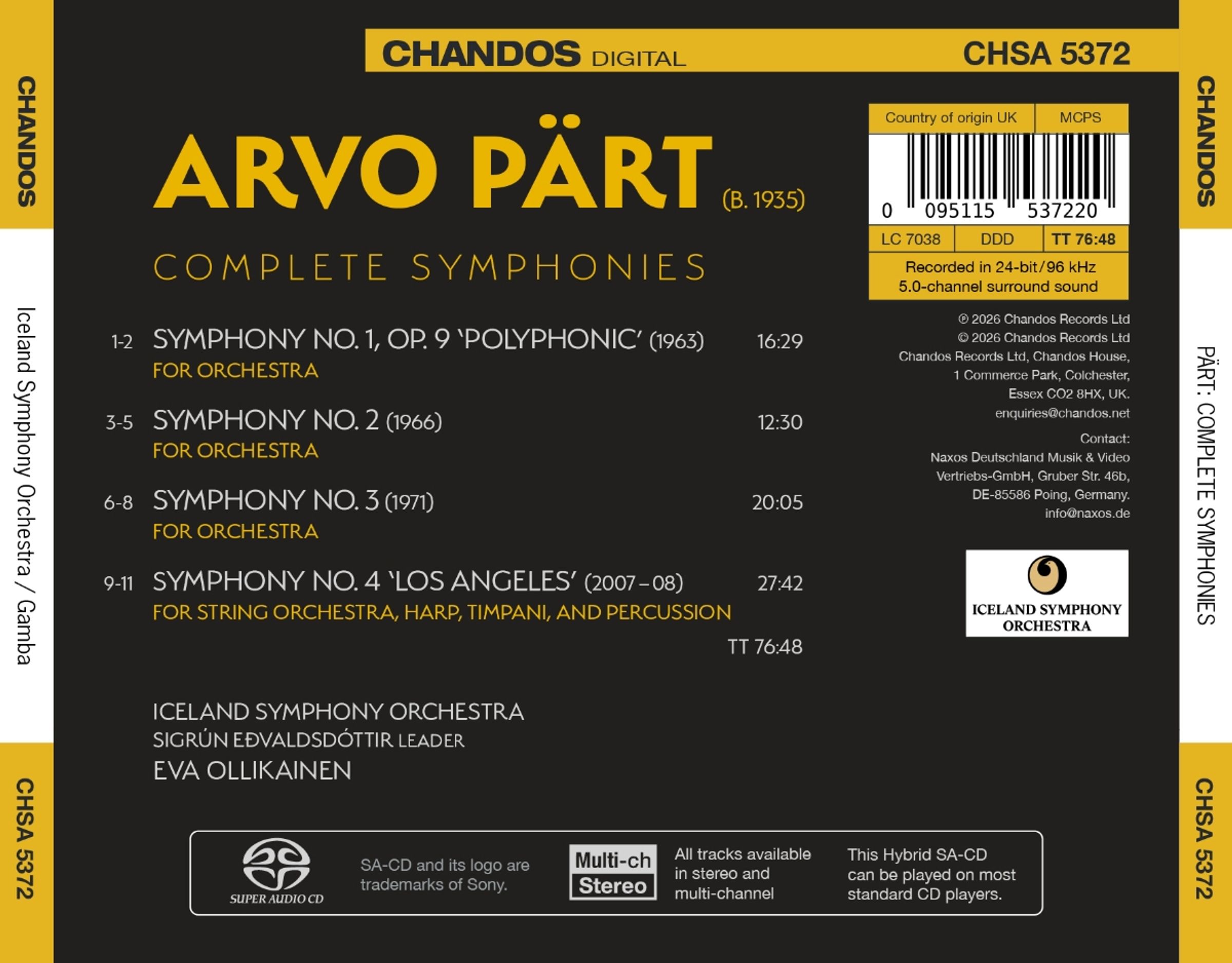 Die vier Sinfonien von Arvo Pärt entstanden im Laufe von fünfundvierzig Jahren und haben wenig oder gar nichts miteinander zu tun – vier Einzelstücke, die sein Schaffen zu verschiedenen Zeitpunkten seines kreativen Werdegangs repräsentieren. Die Erste Sinfonie entstand 1963, kurz nachdem Pärt sein Studium am Konservatorium in Tallinn abgeschlossen hatte. Ihre zweisätzige Struktur lehnt sich an den Barock an – Kanons und Präludium und Fuge –, aber die harmonische Sprache ist äußerst fortschrittlich und weist deutliche Spuren des Zwölfton-Serialismus auf. Die Zweite Sinfonie von 1966 in drei Sätzen verwendet erneut eine Kombination aus Serialismus und Texturen, die an Penderecki und die polnische Schule erinnern. Die ebenfalls dreisätzige Dritte Sinfonie (1971) spiegelt die Zeit wider, die Pärt Ende der 1960er Jahre mit dem Studium mittelalterlicher Gesänge und Musik verbrachte. Die Sinfonie Nr. 4 „Los Angeles” entstand viel später (2007–2008) und ist stilistisch direkt von der sakralen Musik inspiriert. Pärt nahm zwei große Litaneien der orthodoxen Kirche zum Vorbild: den Kanon der Buße und den Kanon zum Heiligen Schutzengel. Dieses letzte Werk, das ungewöhnlicherweise für Streicher, Harfe, Pauken und Schlagzeug komponiert wurde, ist ebenfalls in drei Sätze unterteilt.