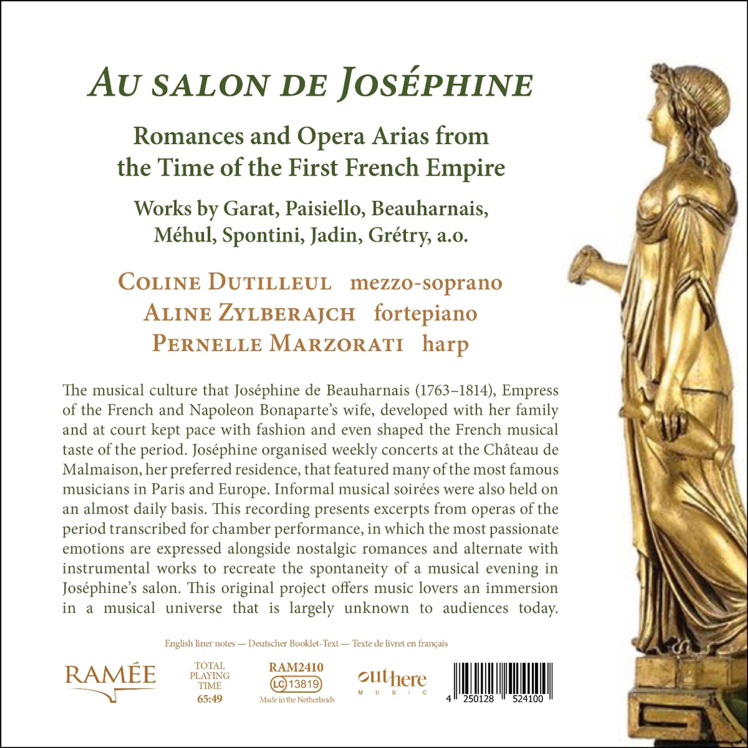 Das Musikleben, das Josephine de Beauharnais (1763-1814), Kaiserin der Franzosen und Ehefrau Napoleon Bonapartes, mit ihrer Familie und am Hofe entwickelte, ging mit der Mode und prägte den französischen Musikgeschmack dieser Zeit. Josephine organisierte wöchentliche Konzerte in ihrer Lieblingsresidenz, dem Chateau de Malmaison, bei denen viele der berühmtesten Musiker aus Paris und Europa auftraten. Fast täglich fanden auch informelle Musikabende statt. Diese Aufnahme präsentiert Auszüge aus Opern dieser Zeit, die für kammermusikalische Aufführungen eingerichtet wurden. Darin kommen die leidenschaftlichsten Emotionen zum Ausdruck und wechseln sich mit melancholischen Romanzen und Instrumentalwerken ab, um die Spontaneität eines Musikabends in Joséphines Salon nachzuempfinden. Dieses originelle Projekt bietet Musikliebhabern die Möglichkeit, in ein Musikuniversum einzutauchen, das dem heutigen Publikum weitgehend unbekannt ist.
