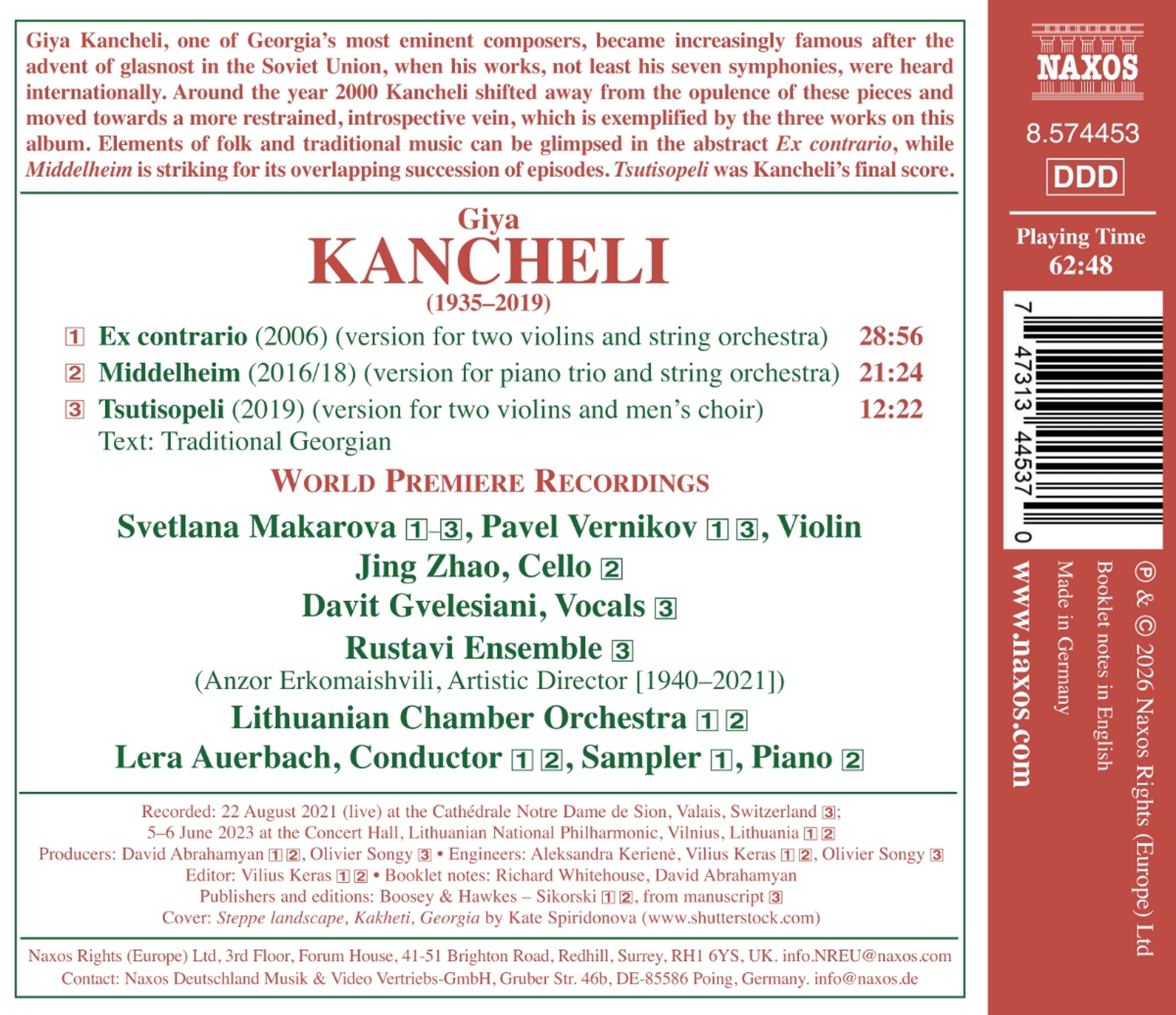 Giya Kancheli, einer der bedeutendsten Komponisten Georgiens, wurde nach dem Beginn der Glasnost in der Sowjetunion immer bekannter, als seine Werke, nicht zuletzt seine sieben Sinfonien, international Beachtung fanden. Um das Jahr 2000 wandte sich Kancheli von der Opulenz dieser Stücke ab und bewegte sich in Richtung einer zurückhaltenderen, introspektiven Stilrichtung, die durch die drei Werke auf diesem Album veranschaulicht wird. Elemente der Volks- und traditionellen Musik lassen sich in dem abstrakten Ex contrario erkennen, während Middelheim durch seine sich überlagernde Abfolge von Episoden besticht. Tsutisopeli war Kanchelis letzte Komposition.