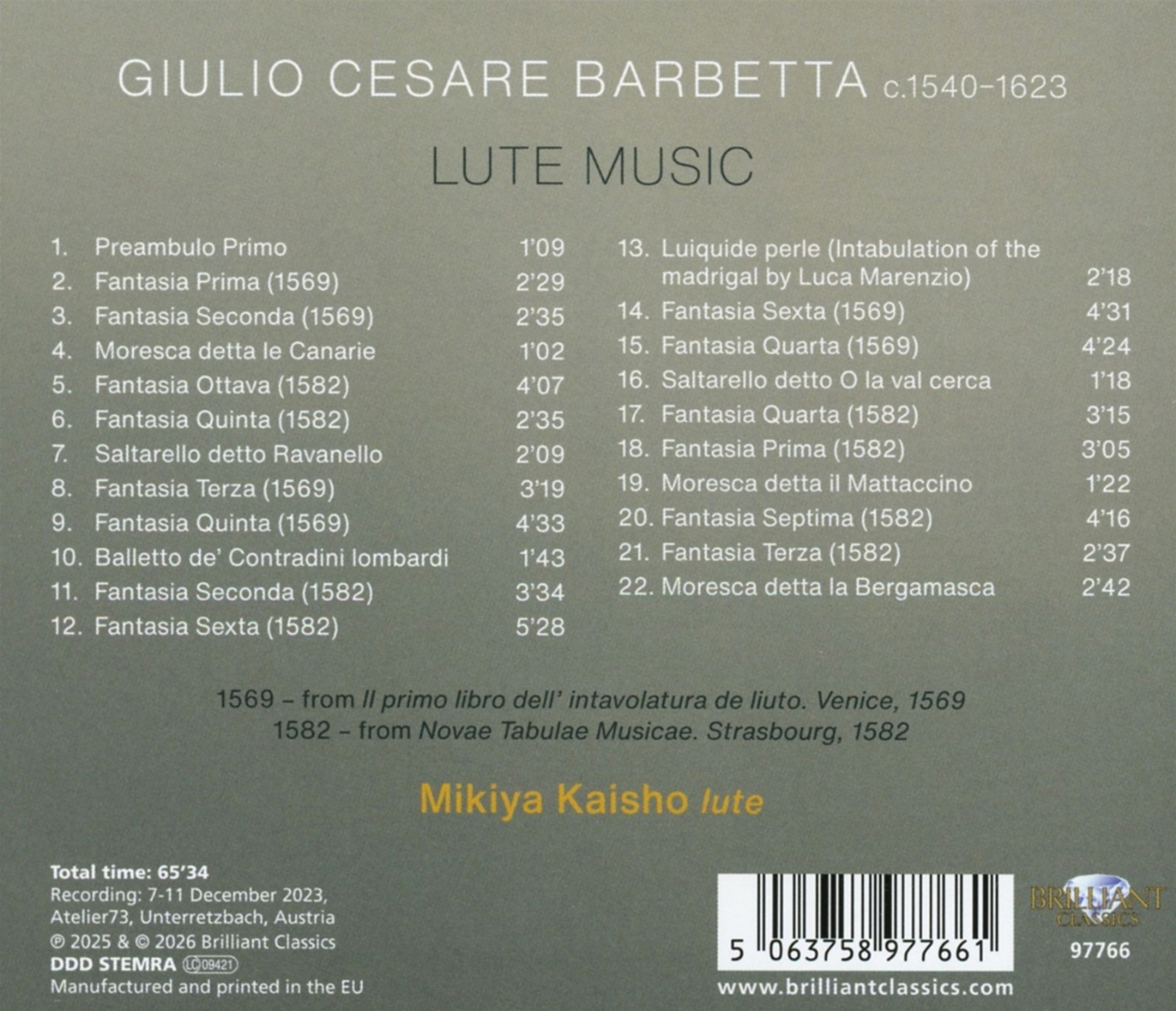 Mit zahlreichen Weltpremierenaufnahmen ist dies das erste Album, das sich ausschließlich der Musik eines Lautenisten und Komponisten aus Padua aus dem 16. Jahrhundert widmet: eine Abfolge virtuoser, unermüdlich kreativer Fantasien und Tänze. Die Musik auf diesem Album stammt aus einer Sammlung von 1582, Novae tabulae musicae testudinariae hexachordae et heptachordae. Das Frontispiz zeigt eine Figur, wahrscheinlich Barbetta selbst, die eine zerbrochene Laute ins Feuer wirft, darunter steht eine trotzige Inschrift: „Ich werde die Laute niemals freiwillig einem Unwissenden oder Neidischen anvertrauen, sondern nur einem, der aus der Flamme geboren ist – denn weder Unwissenheit noch Neid werden jemals erreichen können, was er kann.“ Über den Autor Giulio Cesare Barbetta (ca. 1540–ca. 1623) ist außer der Sammlung selbst wenig bekannt. Barbetta lebte und arbeitete in der Universitätsstadt Padua und kam dort offenbar durch die Mitglieder des deutschen Adels, die die Stadt besuchten, mit deutschen Kulturmodellen in Berührung. Viele seiner 14 Fantasien sind komplexe vierstimmige kontrapunktische Werke, die vom Interpreten sowohl technische Meisterschaft als auch ein tiefes Verständnis der musikalischen Struktur erfordern. Im Gegensatz dazu schrieb (oder bearbeitete) Barbetta nicht nur traditionelle italienische Tänze wie den Saltarello, sondern auch Stücke mit exotischem Charakter, wie beispielsweise die Moresca, einen traditionellen maurischen Tanz aus Nordafrika.