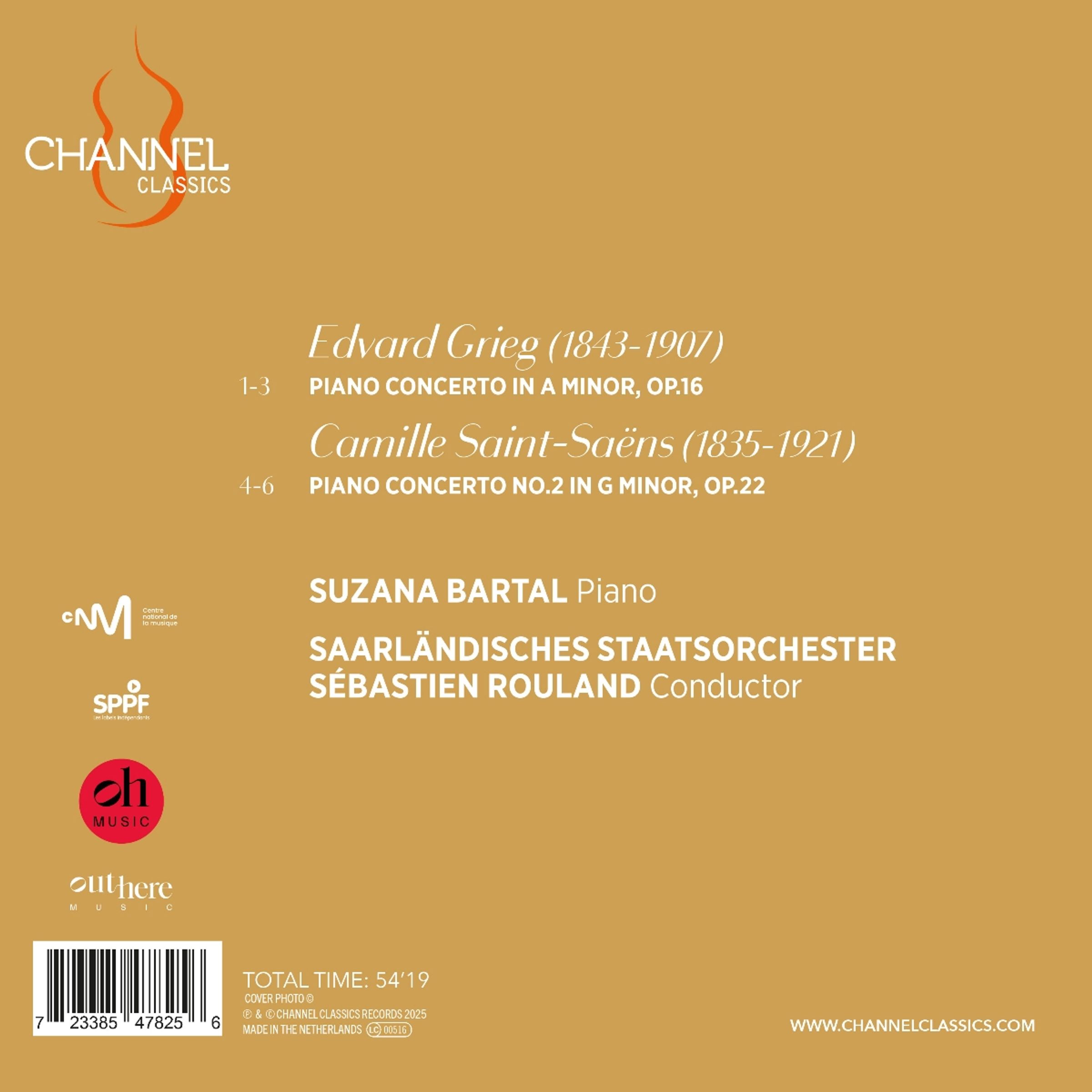 Die französisch-ungarische Pianistin Suzana Bartal spielt zusammen mit Sébastien Rouland und dem Saarländischen Staatsorchester zwei Dauerbrenner des romantischen Repertoires ein: Griegs Klavierkonzert in a-Moll und Camille Saint-Saëns' Klavierkonzert Nr. 2 in g-Moll. Obwohl das 2. Klavierkonzert von Saint-Saëns bei seiner Uraufführung mit dem Komponisten am Klavier keinen Erfolg hatte, wurde es später vom Publikum geliebt und ist wahrscheinlich das meistgespielte seiner fünf Klavierkonzerte. Nur wenige Musikstücke sind so ikonisch wie das einzige Konzert, das Grieg je vollendet hat: sein berühmtes Klavierkonzert in a-Moll. Als es 1870 entstand, hat Liszt es bekanntlich vom Blatt gelesen und in den höchsten Tönen gelobt; seither ist es eines der beliebtesten Werke der Klassik.