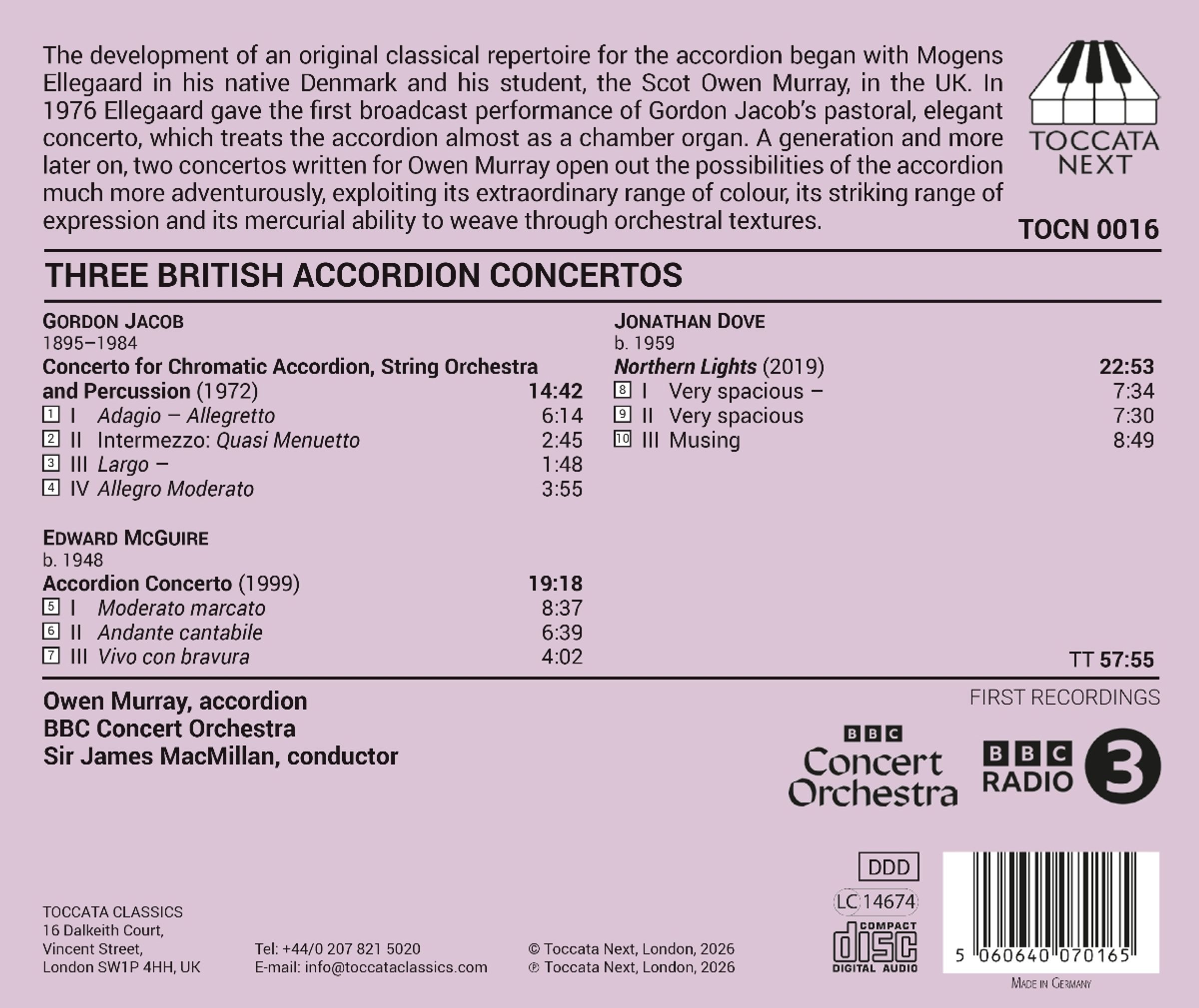 Text: "Three British Accordion Concertos. Music by Jonathan Dove, Gordon Jacob, Edward McGuire." Oben Polarlichter., CD